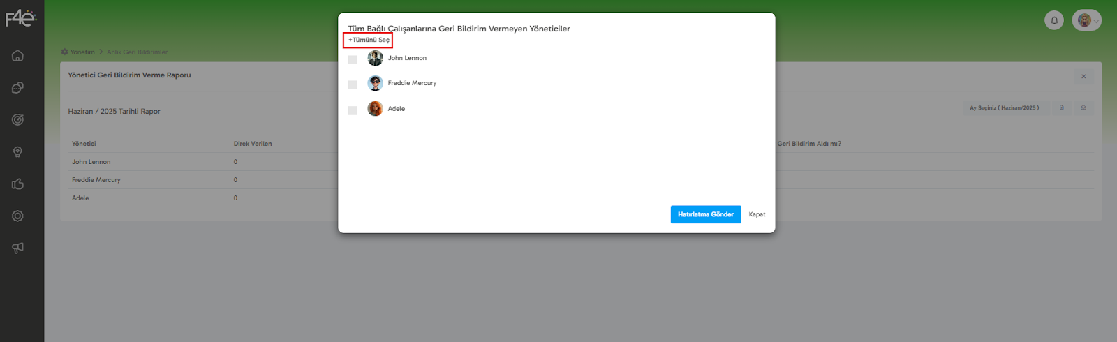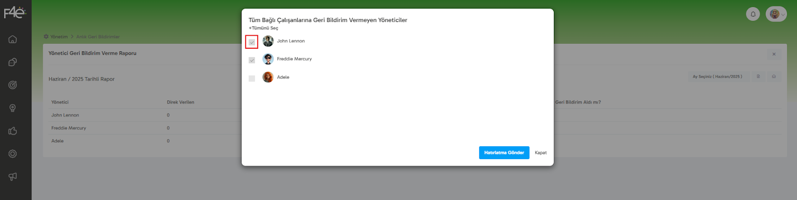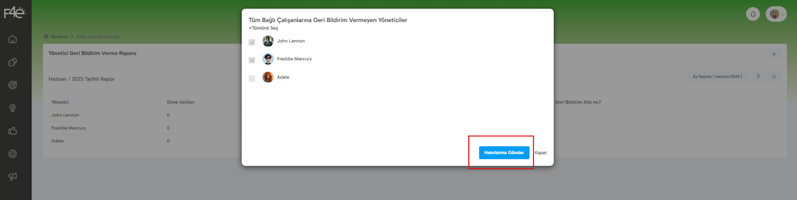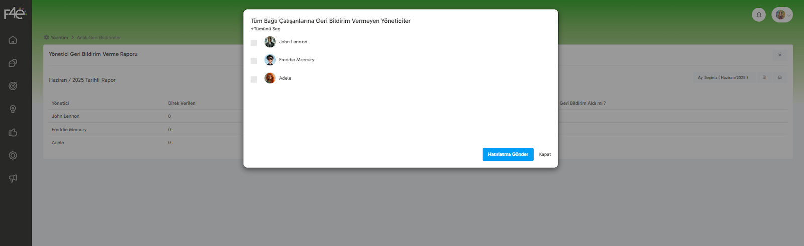 Açılan pop-up ekranında, o ay çalışanlarına geri bildirim vermemiş yöneticilerin listesi gösterilir