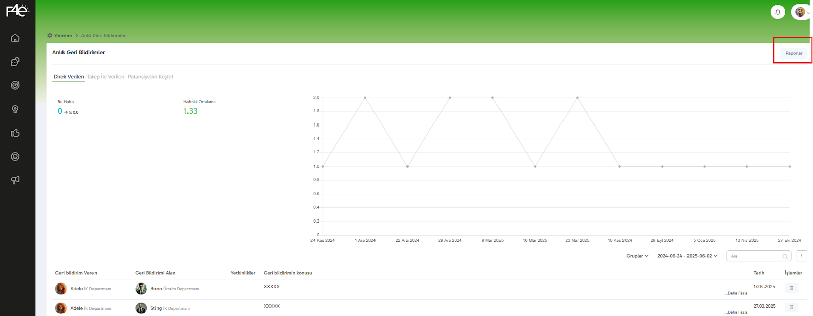 Geri Bildirim Modülüne Ait Raporlar Nereden Alınır? F4e platformundaki Geri Bildirim Modülü, çalışanların birbirine anlık ve yapıcı geri bildirimler vermesini kolaylaştırırken, yöneticiler için de detaylı raporlama imkanı sunar. Tüm bu raporlar ...