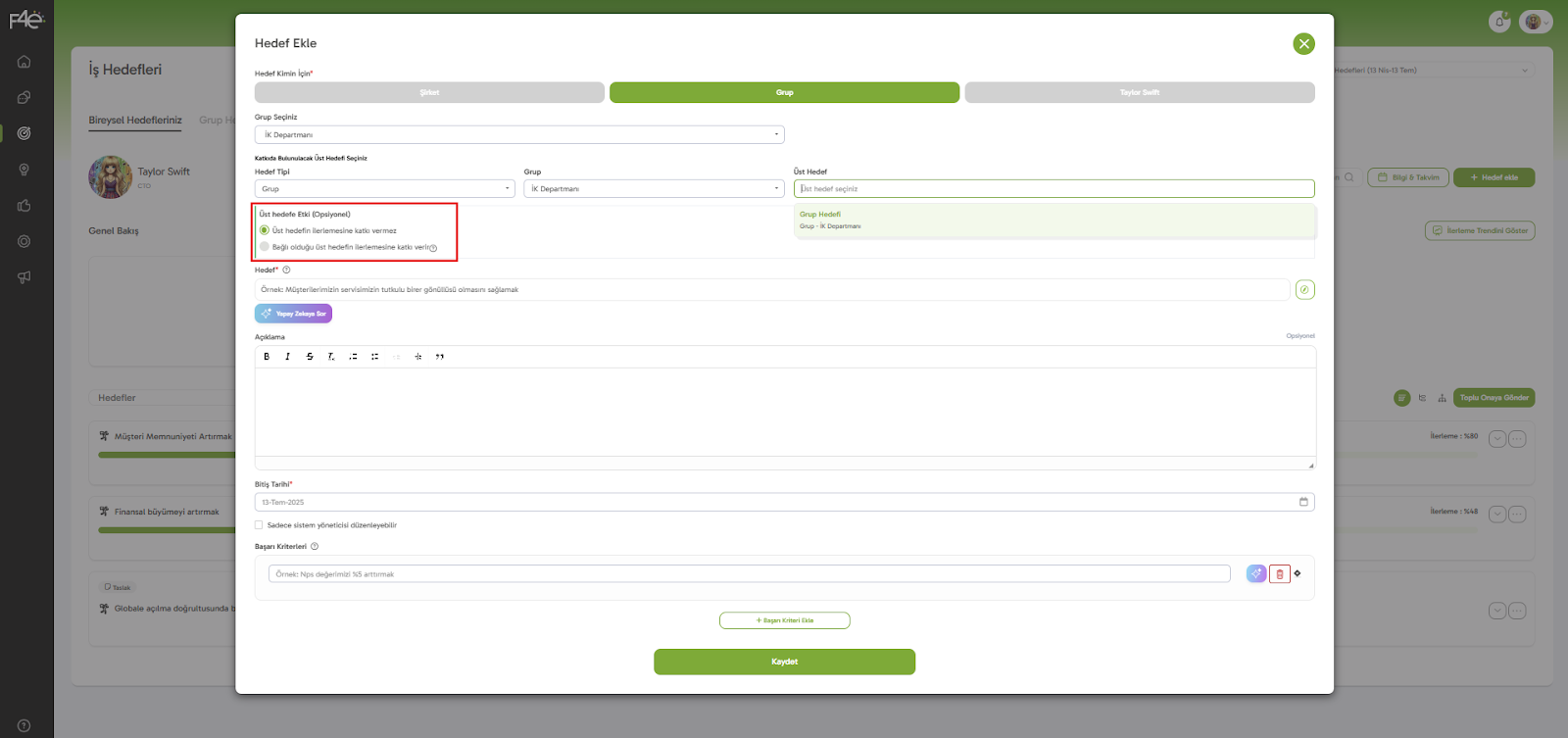Üst hedefe başarı kriteri tanımlarsan, ilerleme yalnızca bu kriterlere göre hesaplanır.