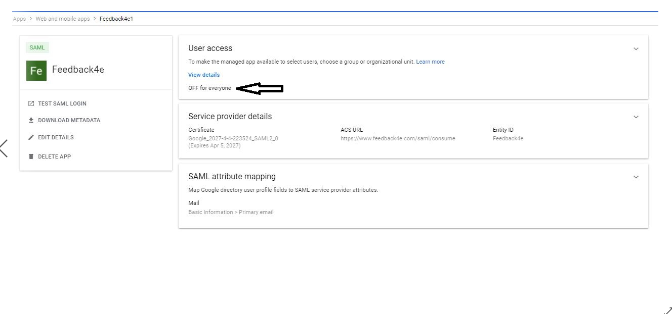 Kullanıcılar için uygulamayı aktif ettiğine göre her şey neredeyse tamam. Uygulama sayfasında "Download Metadata" linkine tıklayarak saml dosyanı indir.