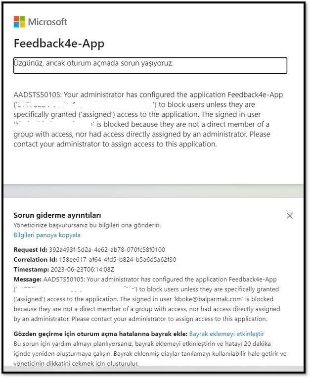 Azure ile Saml tabanlı SSO entegrasyonu yaptığınız çoğu kullanıcı problem yaşamıyor ancak bazı çalışanlar giriş yaparken aşağıdakine benzer bir hatayı alıyorsa, Azure konfigurasyonunuzda eksik var demektir. SSO entegrasyonu için Azure üzerinde oluşturmuş olduğunuz Feedback4e uygulamasına bu kullanıcıyı dahil etmeniz gerekmektedir. Azure konfigurasyonundan sorumlu IT personeliniz ile iletişime geçerek Feedback4e.com üzerinde tanımladığınız kullanıcının, Azure Feedback4e SSO uygulamasına da tanımlanmasını talep ediniz.
