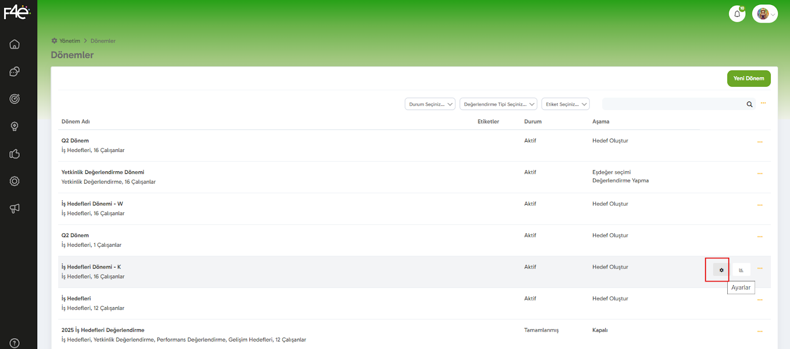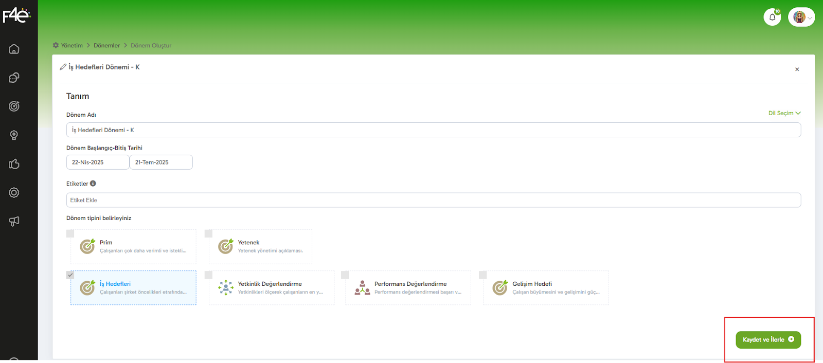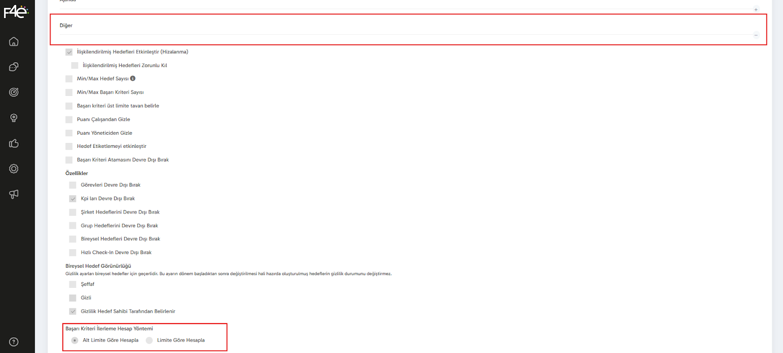 Yönetim → Dönem Yönetimi → Hedef Dönemi Ayarları → Diğer → Başarı Kriteri İlerleme Hesap Yöntemi