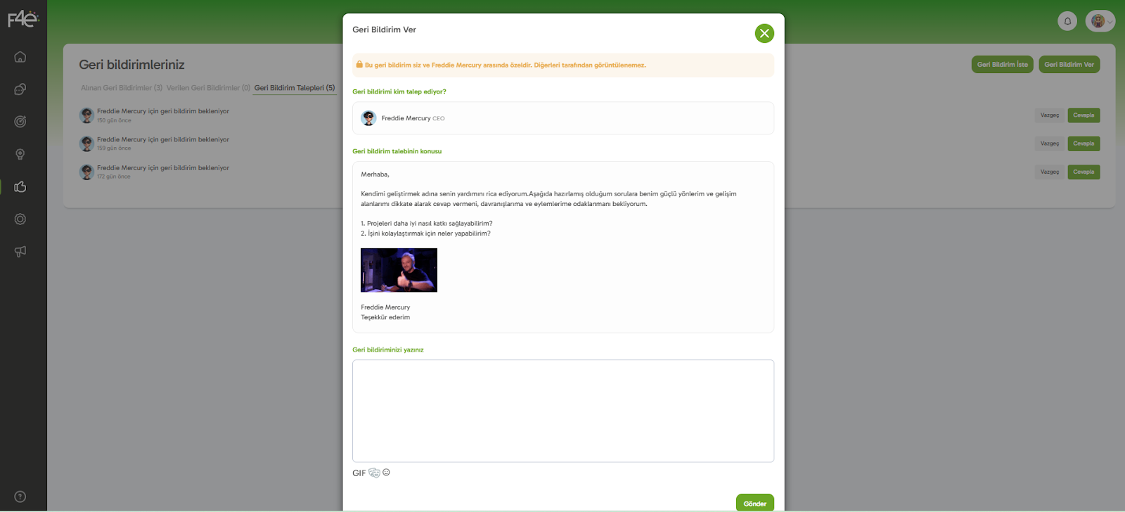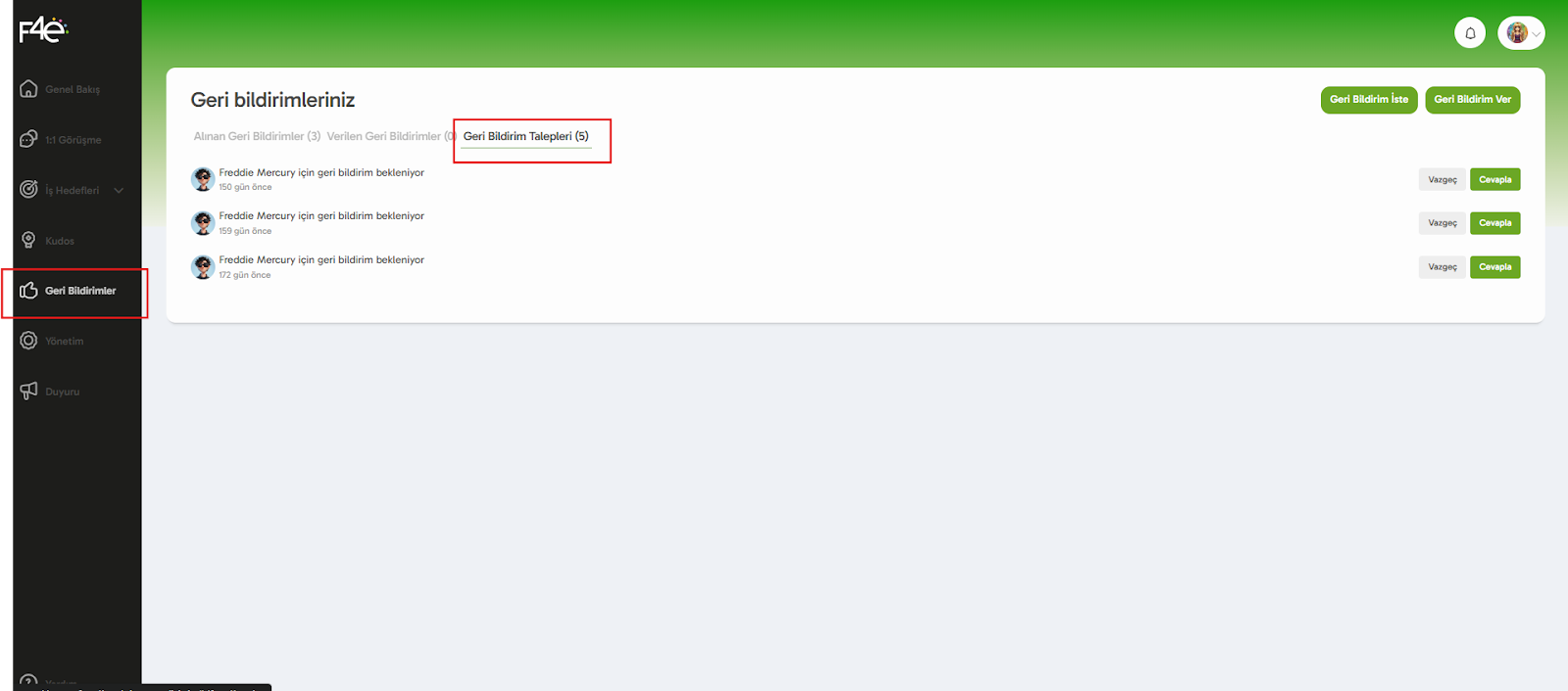 F4e platformunda, biri sizden geri bildirim istediğinde sistem hem bilgilendirme gönderir, hem de süreci adım adım takip etmenizi kolaylaştırır. Aşağıda, gelen talepleri nereden görüntüleyeceğinizi ve nasıl yanıtlayabileceğinizi adım adım anlattık. 👇