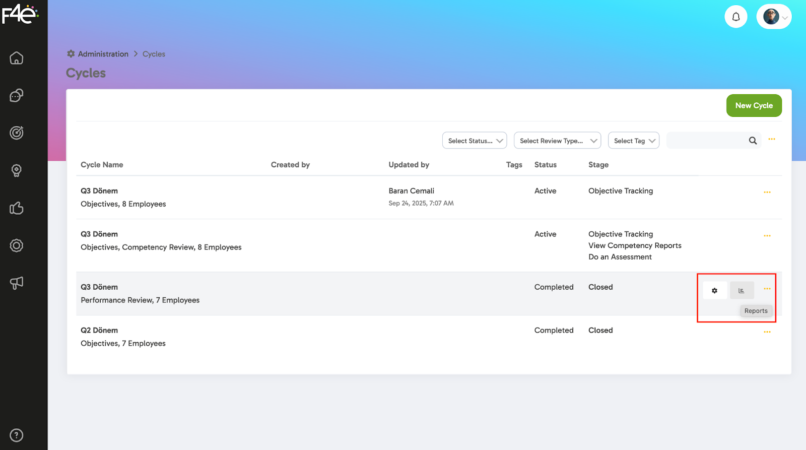 Admin > Cycle Management > Relevant Cycle > Reports Icon