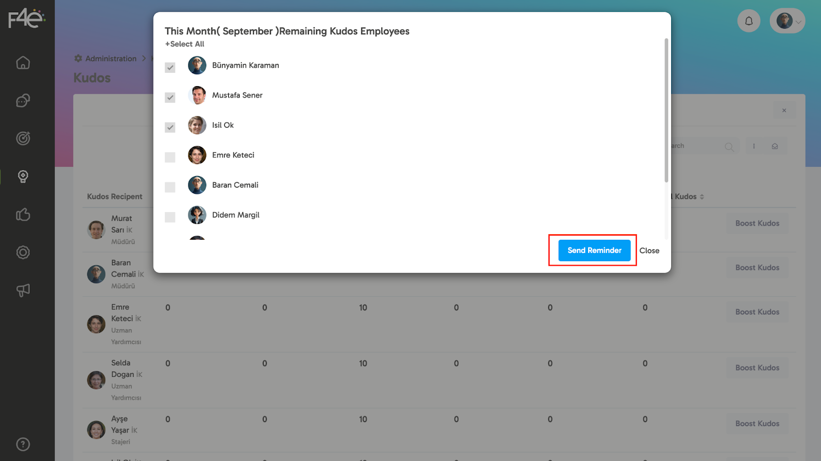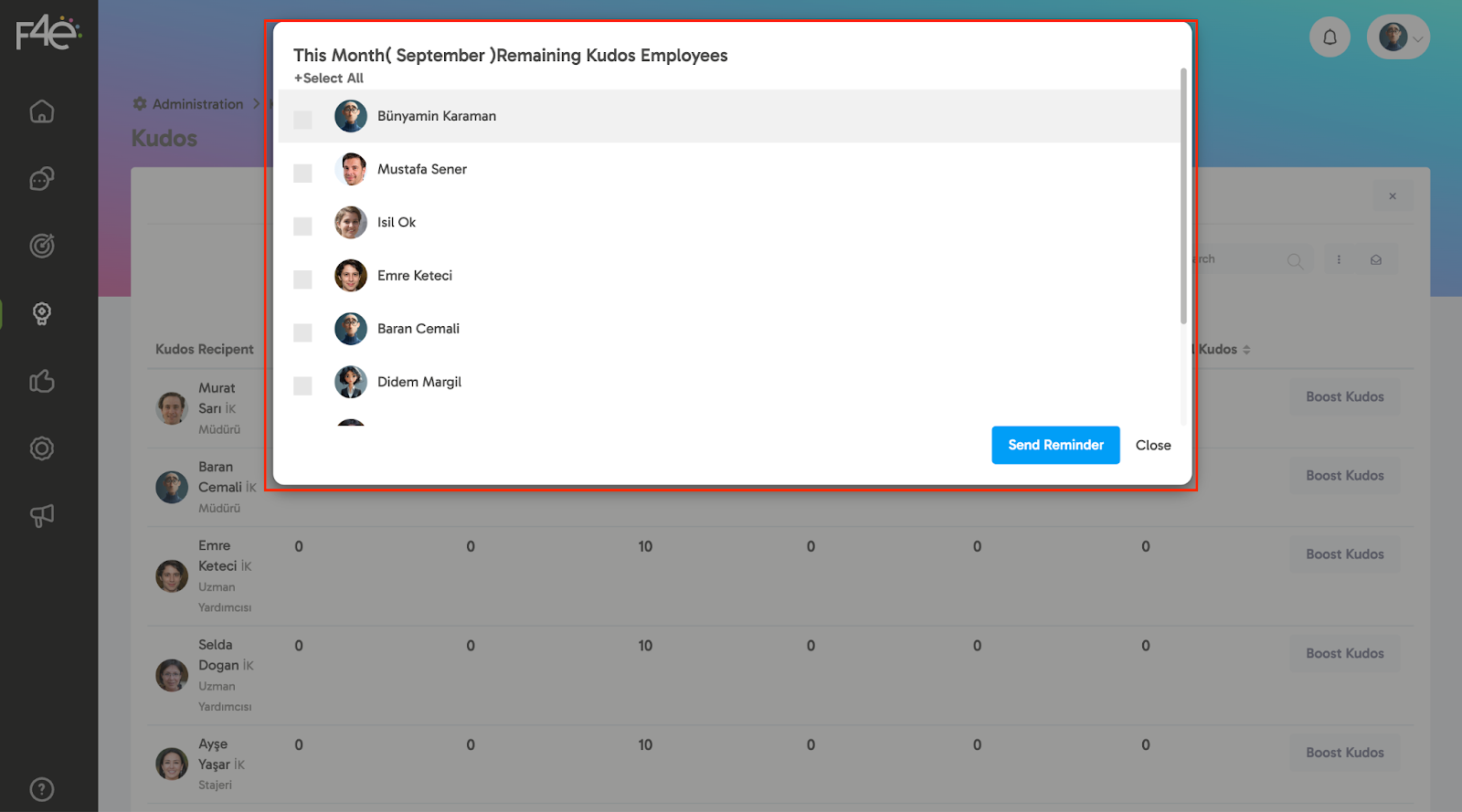A pop-up window will appear, listing all employees who still have kudos left for the current month.