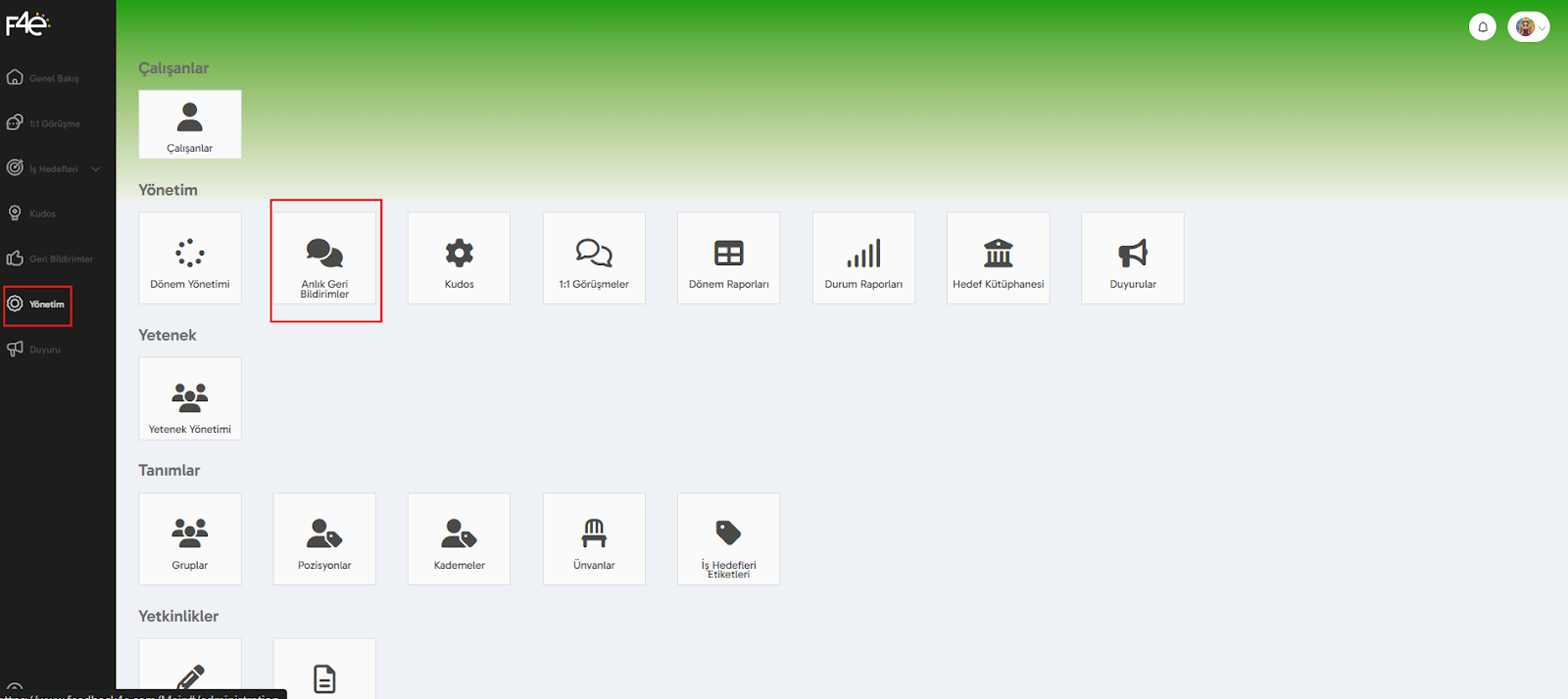 Yol: Yönetim > Anlık Geri Bildirimler
