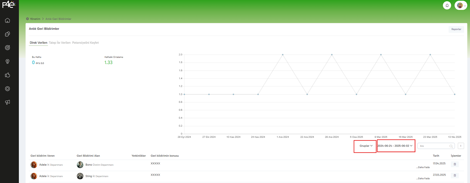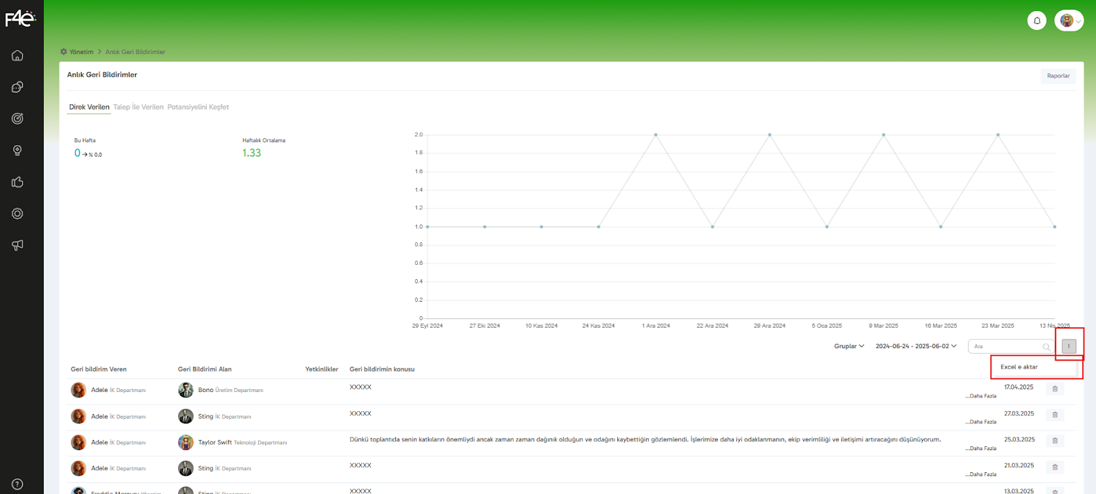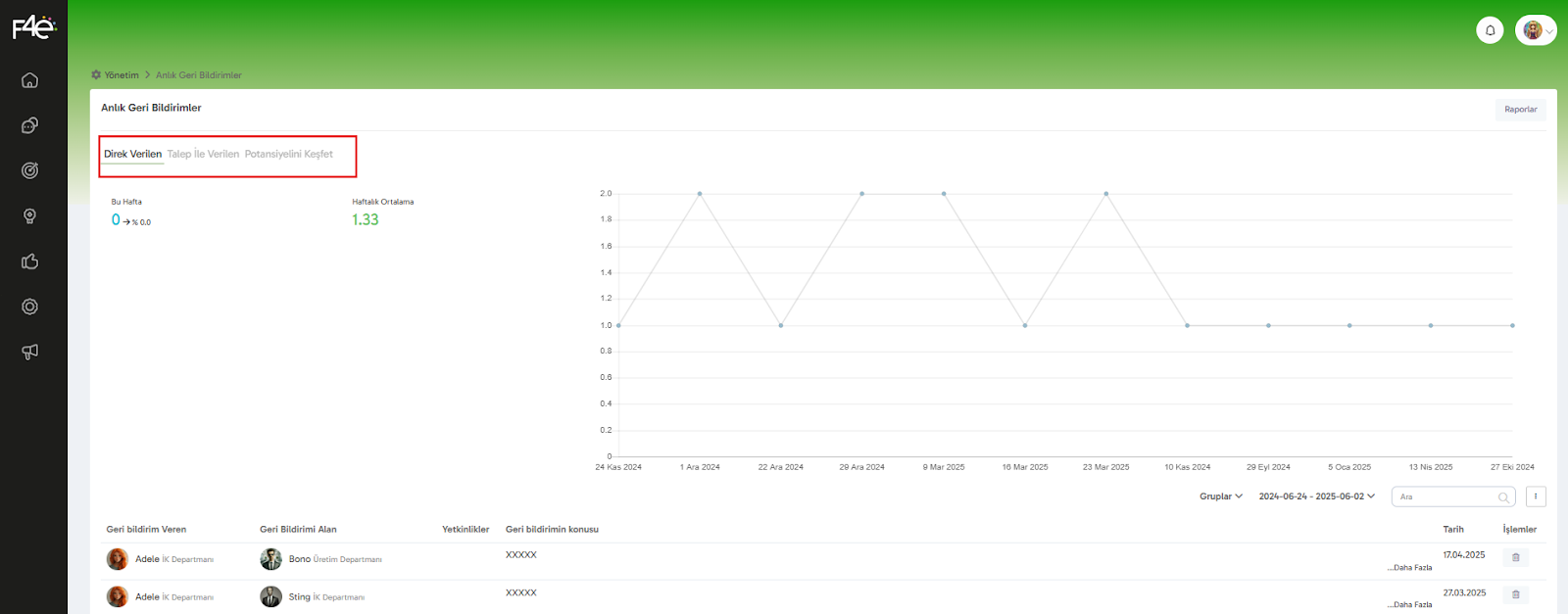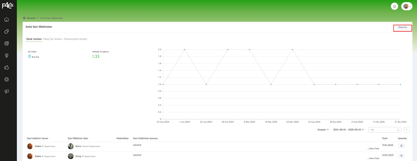 F4e platformundaki Geri Bildirim Modülü, çalışanların birbirine anlık ve yapıcı geri bildirimler vermesini kolaylaştırırken, yöneticiler için de detaylı raporlama imkanı sunar. Tüm bu raporlar sistemde kolayca erişebileceğiniz şekilde yapılandırılmıştır.