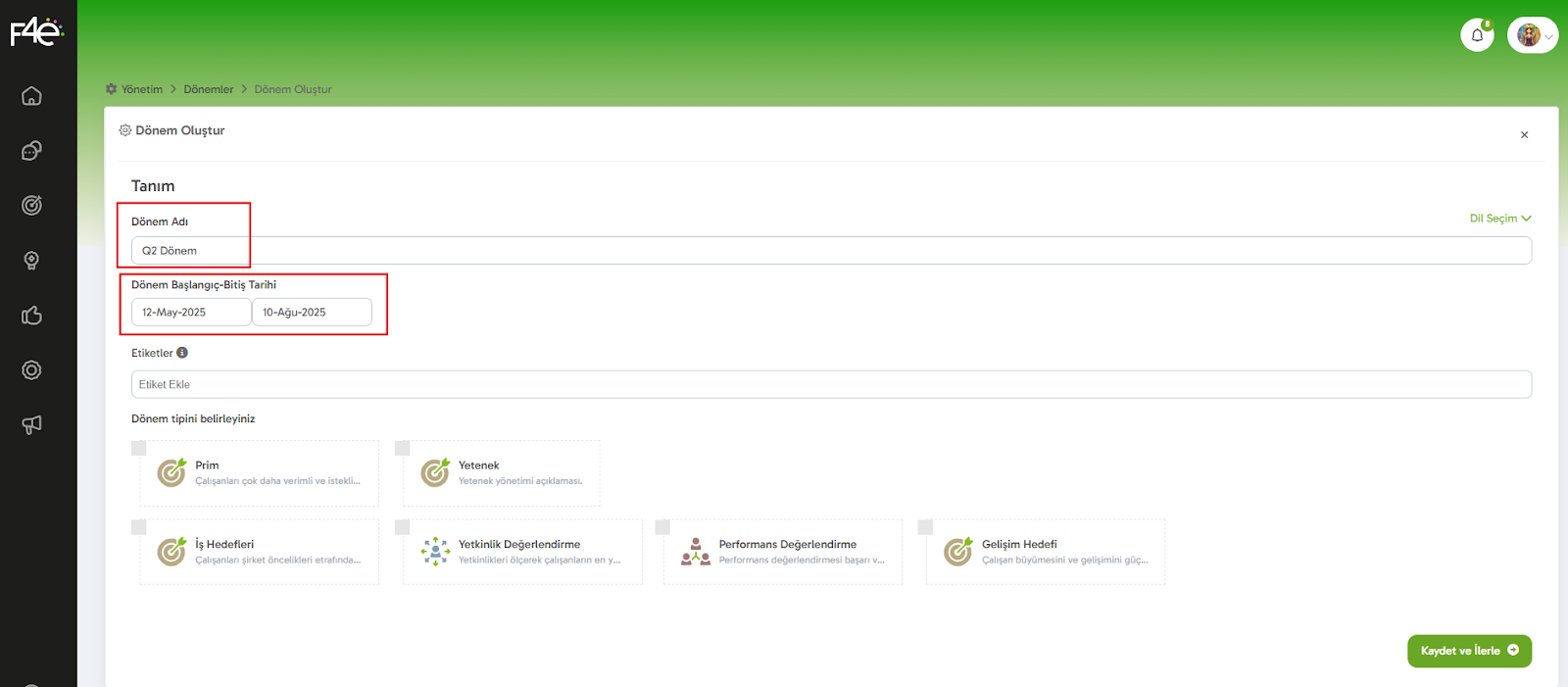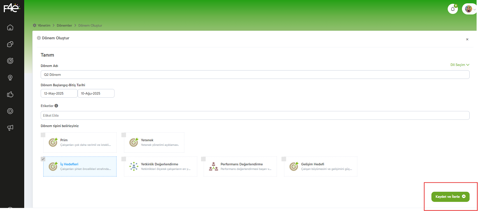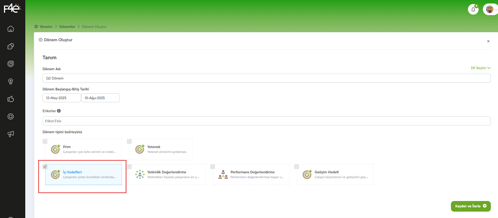 Dönem tipi olarak “İş Hedefleri” seçeneğini işaretlemeyi unutma! Bu, dönemin sadece iş hedeflerine odaklanmasını sağlayacaktır veya aynı anda birden fazla dönem tipini seçerek de ilerleyebilirsin.