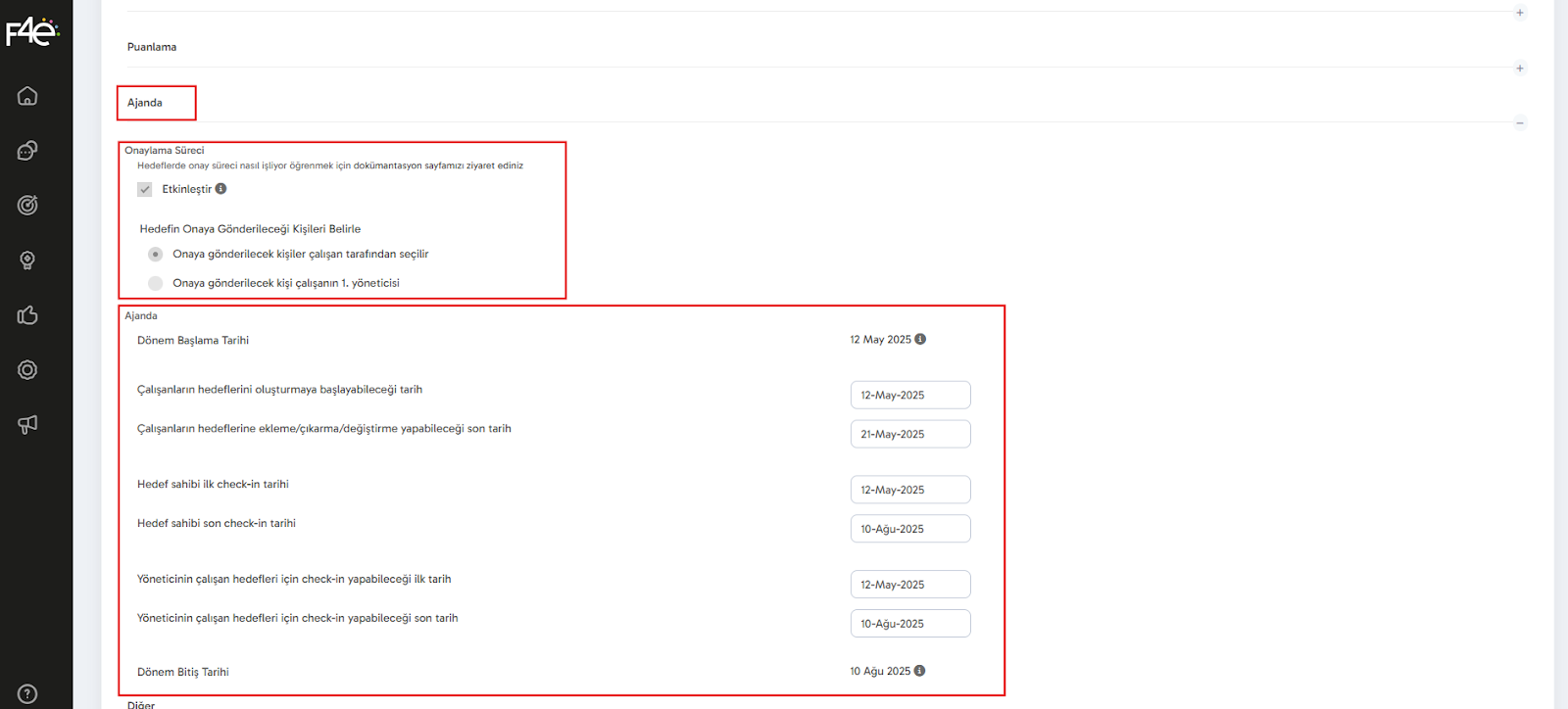 Aşağıda yer alan tarih alanları ile, dönem içerisindeki aksiyonların başlangıç ve bitiş tarihlerini belirleyebilirsin. Dönem içerisinde de bu tarihlerde değişiklik yapabilirsin.