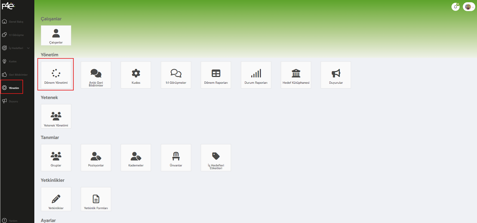 Sistem içerisinde İş Hedeflerine ait özellikleri kullanmak istemezsen, buradaki dönem ayarları içerisinden kapatabilirsin. Örneğin, dönemde grup/departman hedefi yoksa modül içerisinde bu sekmenin görünmesini istemeyebilirsin. O zaman Grup Hedeflerini devre dışı bırak seçeneğini seçebilirsin.