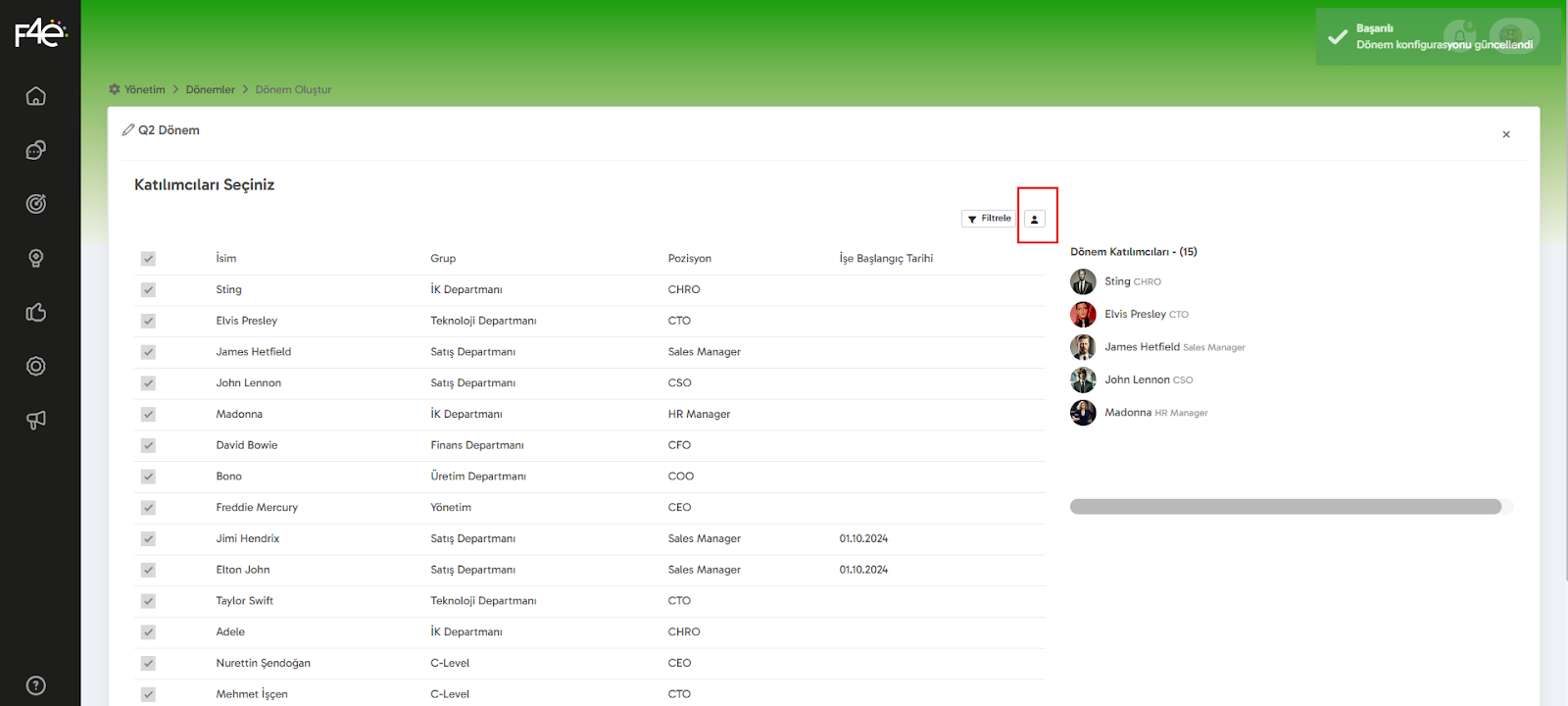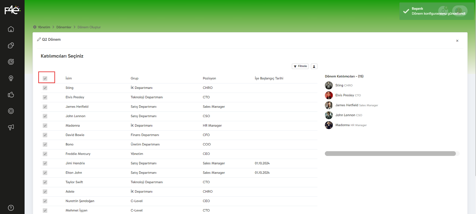 “Kaydet ve İlerle” butonuna tıkladığında, katılımcıları seçme ekranı karşına çıkacak. Burada döneme dahil etmek istediğin katılımcıları manuel olarak seçebilir ya da tüm şirketteki çalışanları dahil etmek istersen “İsim” yazısının solunda yer alan kutucuğu işaretleyebilirsin.