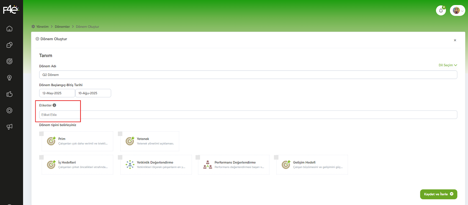 Dönem için bir etiket eklemek istersen bu kısmı doldurabilirsin. Etiketler, dönemlerinizi kategorize etmeyi sağlar.