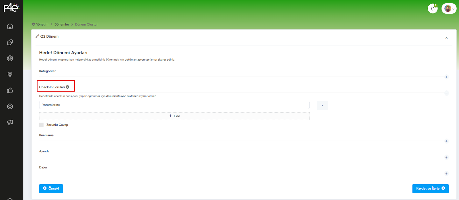 Hedeflerin ilerlemesini takip etmek için check-in soruları belirleyebilirsin. Bu sorularla kullanıcılar, hedeflere dair ilerlemelerini, karşılaştıkları zorlukları veya başarılarını bildirebilirler.