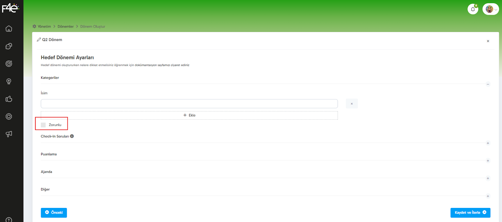 Kategori tanımlandığında, kullanıcılar hedeflerini oluştururken bu kategoriye zorunlu olarak seçim yapmalarını istersen aşağıda yer alan “Zorunlu” kutucuğunu işaretlemeyi unutma.