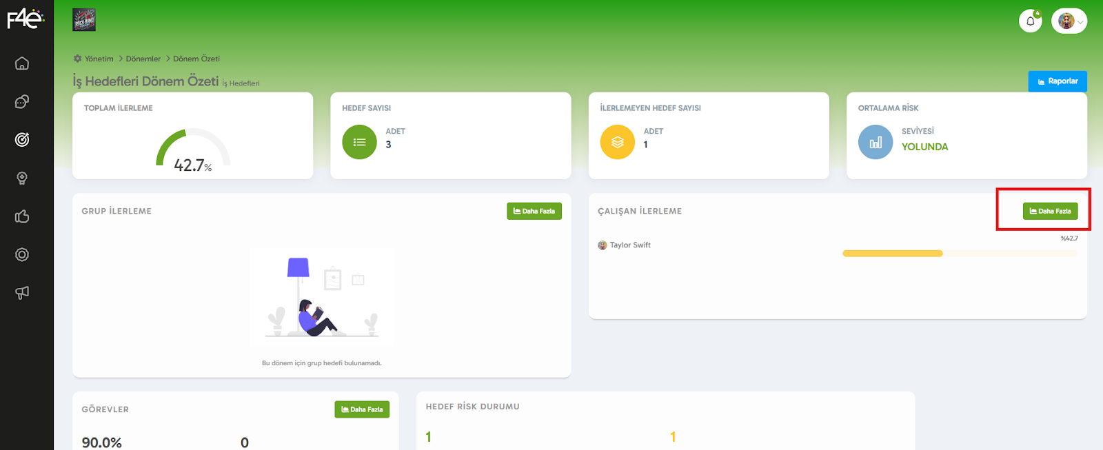 1️⃣ Yönetim > Dönem Yönetimi > Raporlar > Çalışan İlerleme/Daha Fazla sekmelerine geç.
