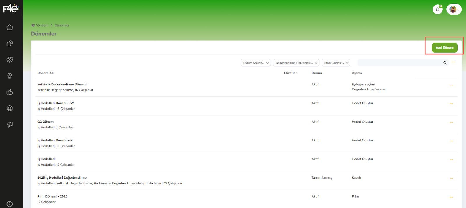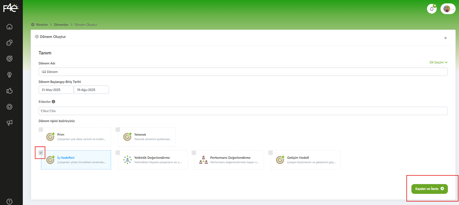 Sağ üstteki yeşil "Yeni Dönem" butonuyla yeni bir dönem oluşturarak "Kaydet ve İlerle" diyerek Hedef Dönemi Ayarları ekranına geç. Bu ekranın açılabilmesi için açtığın dönemde İş Hedefleri dönem tipininde olması gerekir.