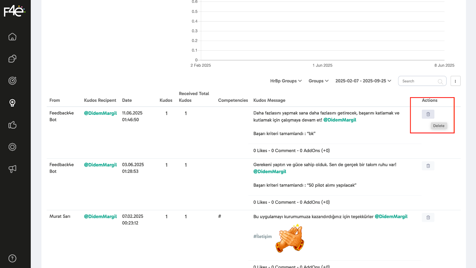 On this page, you will see a detailed list of all kudos sent in the system, including: