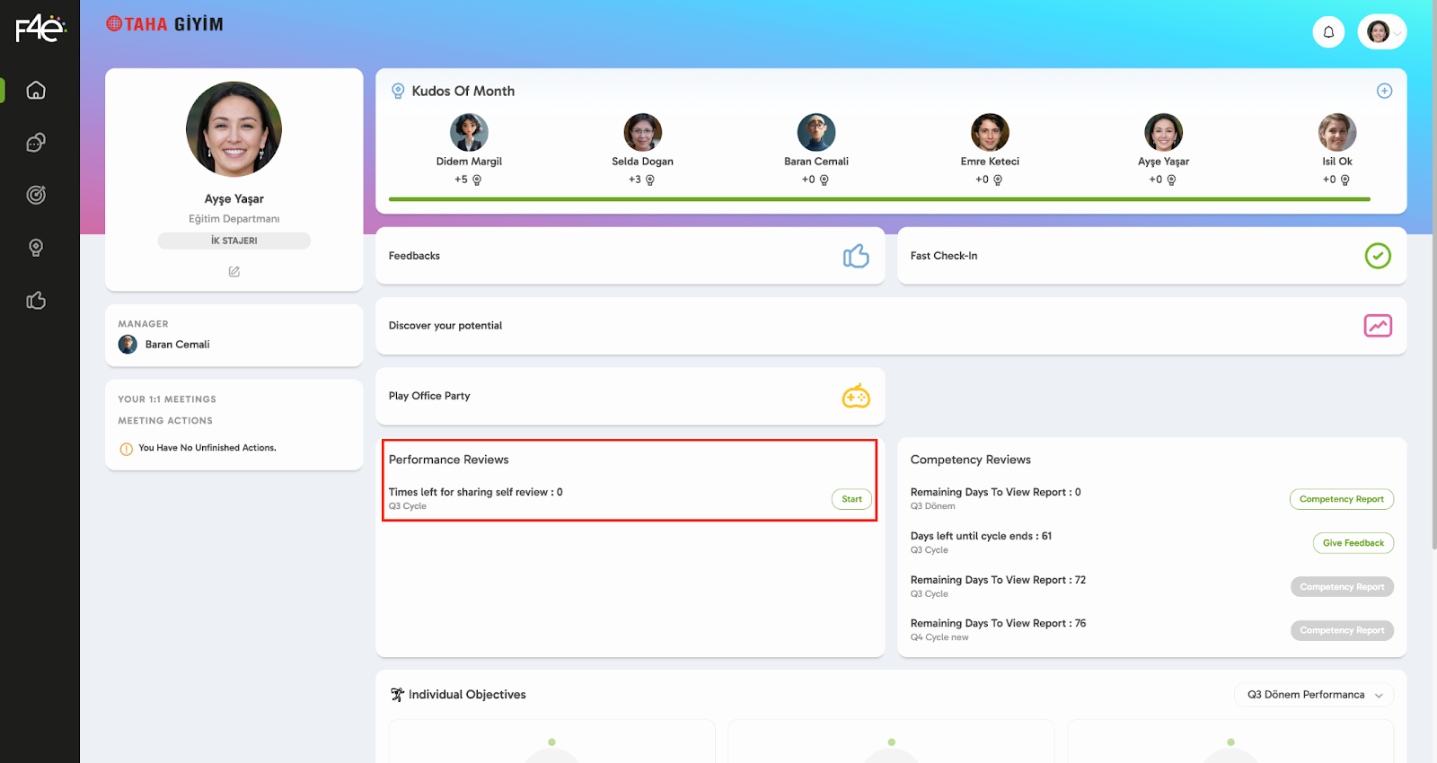 Manager Dashboard: The manager sees both their own self-evaluation form and a list of evaluations to complete for their team members.