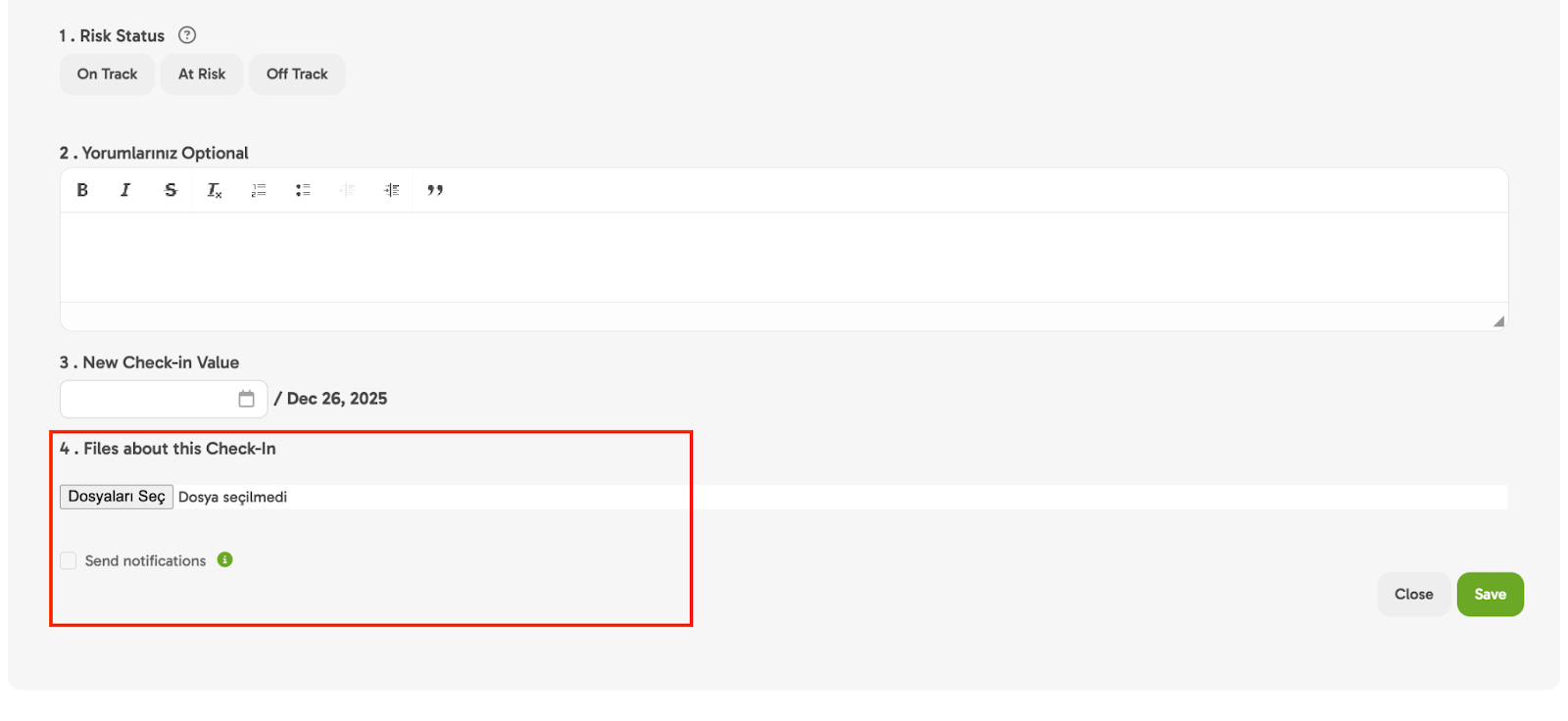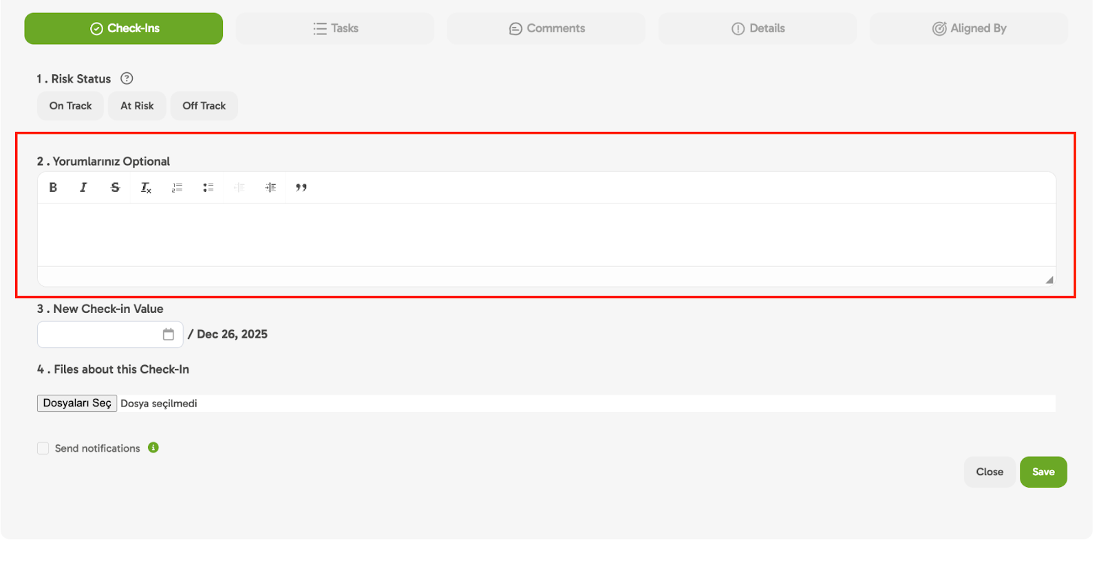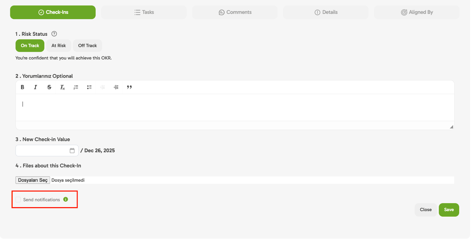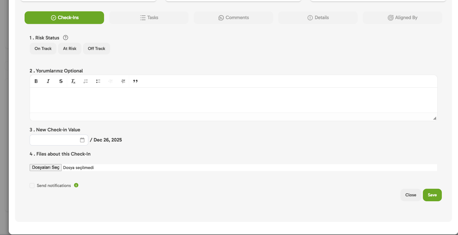 📊 Indicators like Total Progress and Goal Risk Status in the system are calculated based on these Check-Ins.