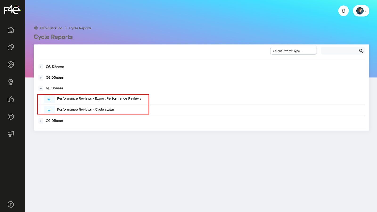 Admin > Cycle Reports > Click the “Plus (+)” icon next to the cycle name > Download all Excel reports for the performance evaluation cycle