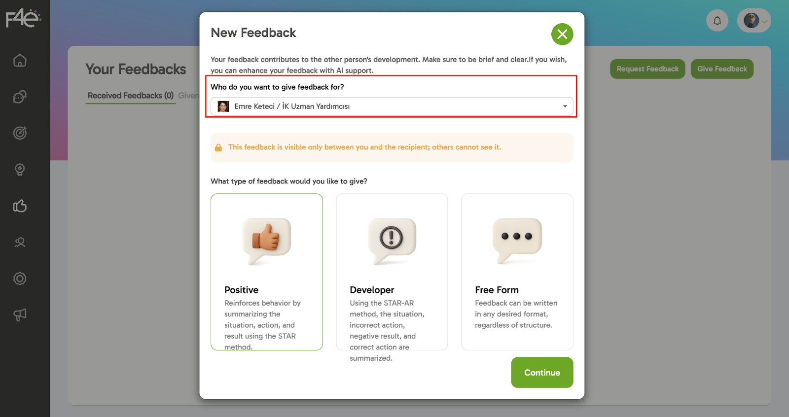 The Feedback Module on the F4e platform enables employees to give fast, effective, and constructive feedback to each other.