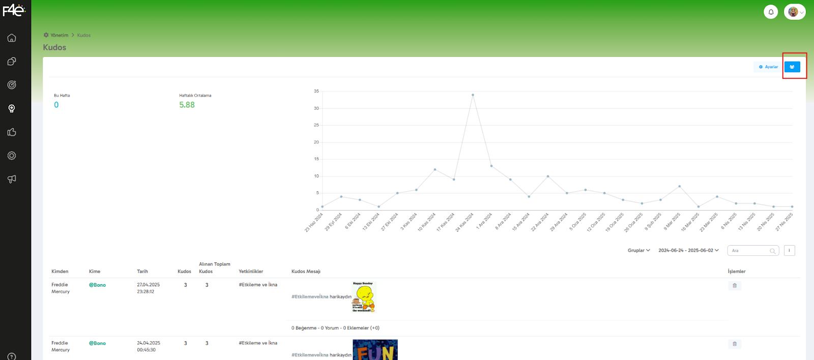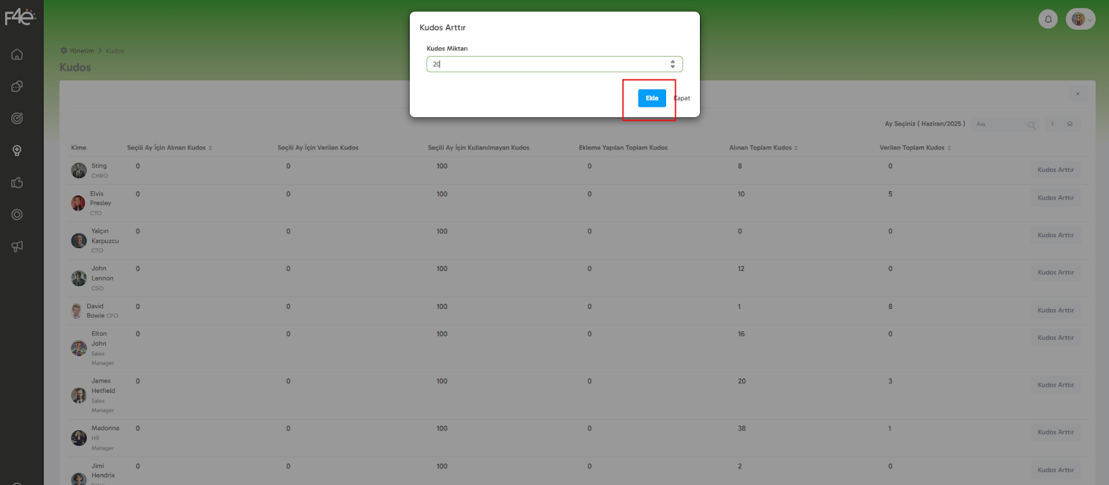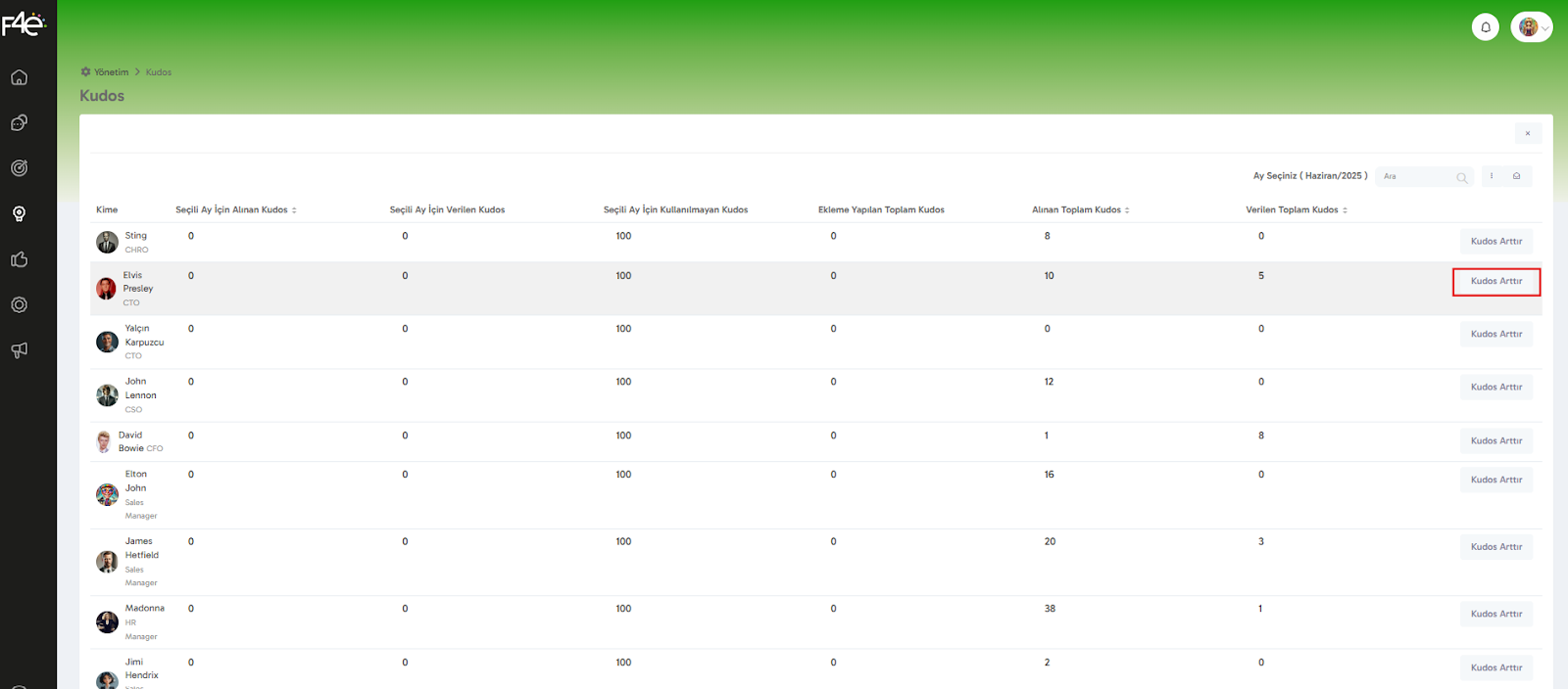 Her çalışanın hizasında, sağ tarafta “Kudos Arttır” butonunu göreceksiniz