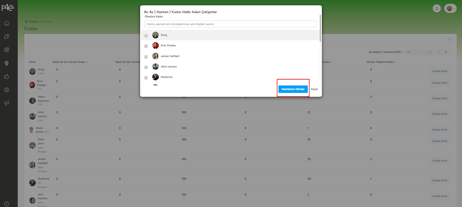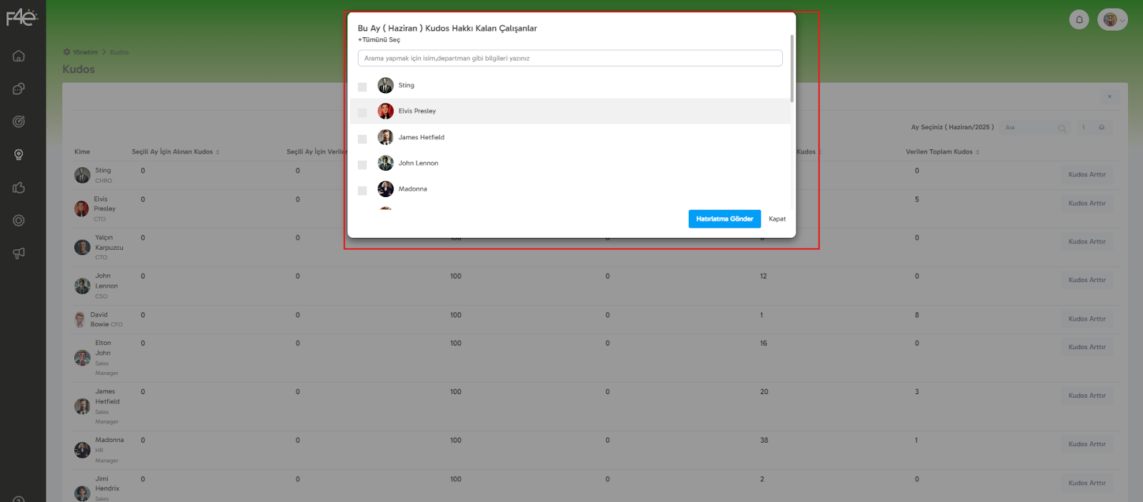 Karşınıza çıkan pop-up ekranında, bu ay için kudos kotası kalan tüm çalışanlar listelenir.
