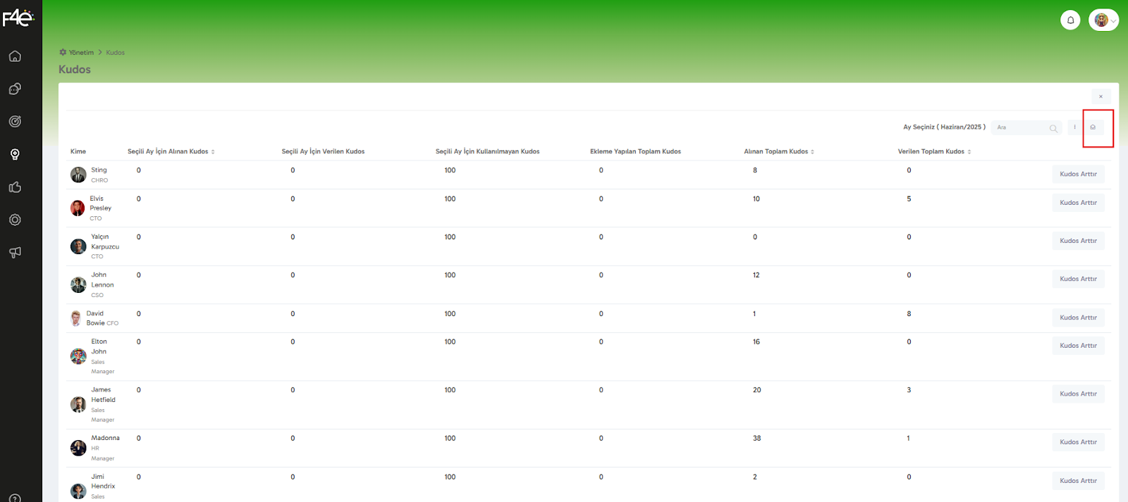 Açılan sayfada tüm çalışanların kudos kotaları hakkında bilgilerin bulunduğu liste görünümü sizi karşılayacak.