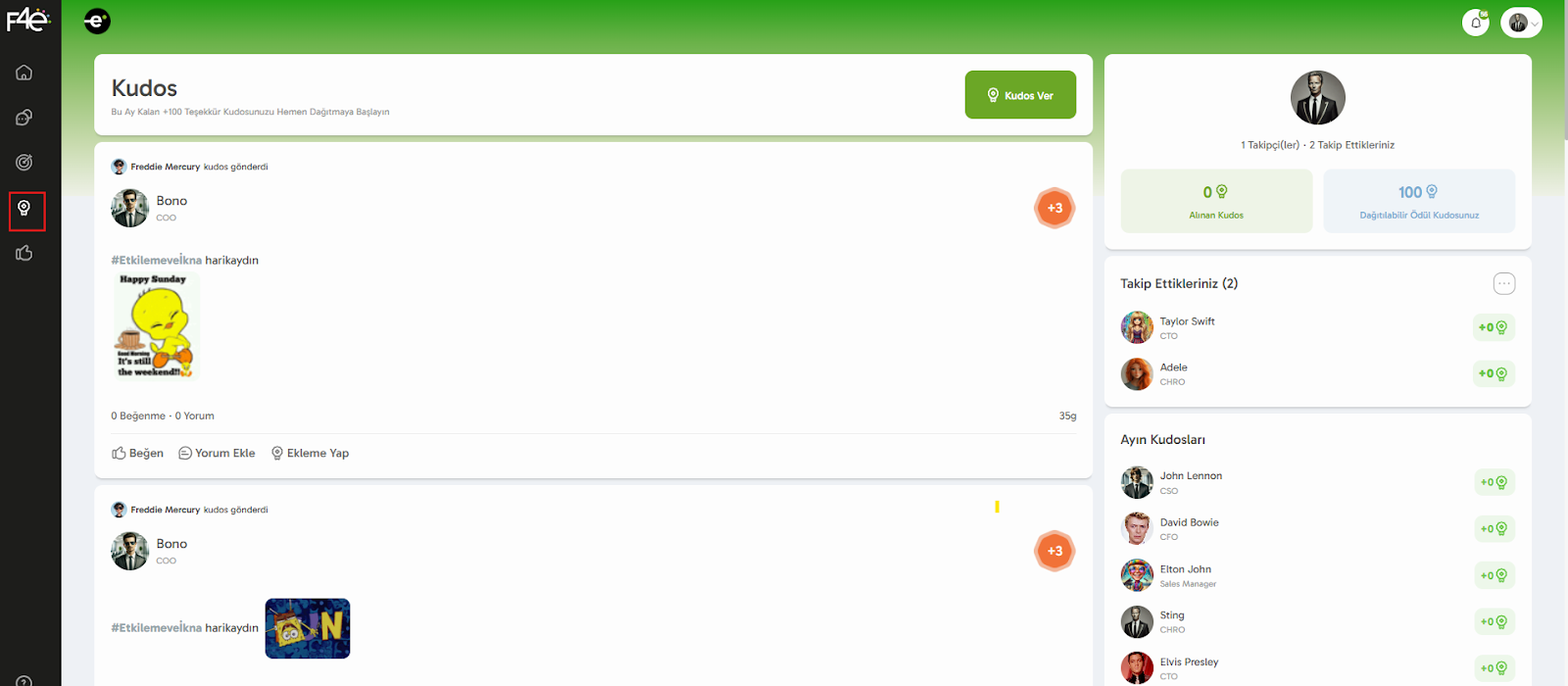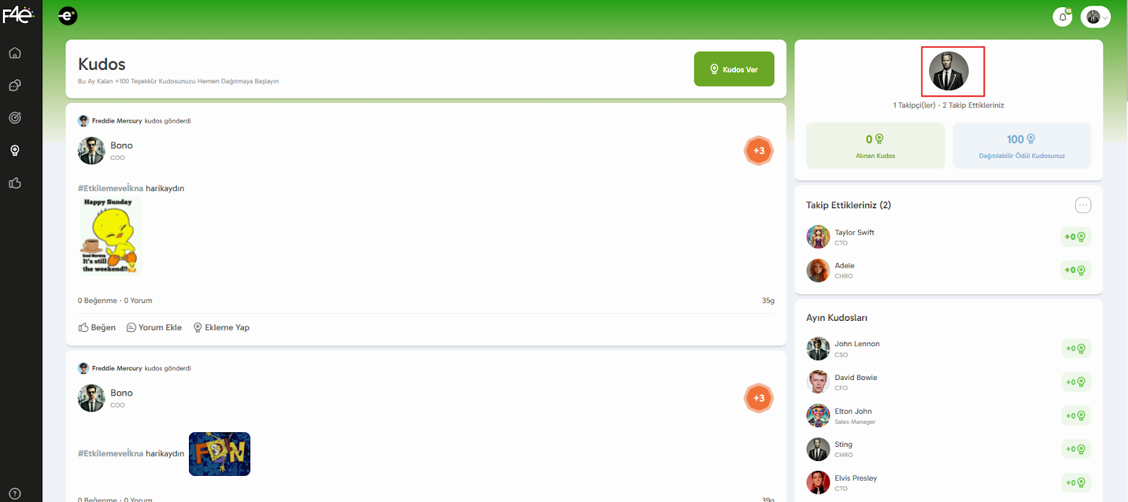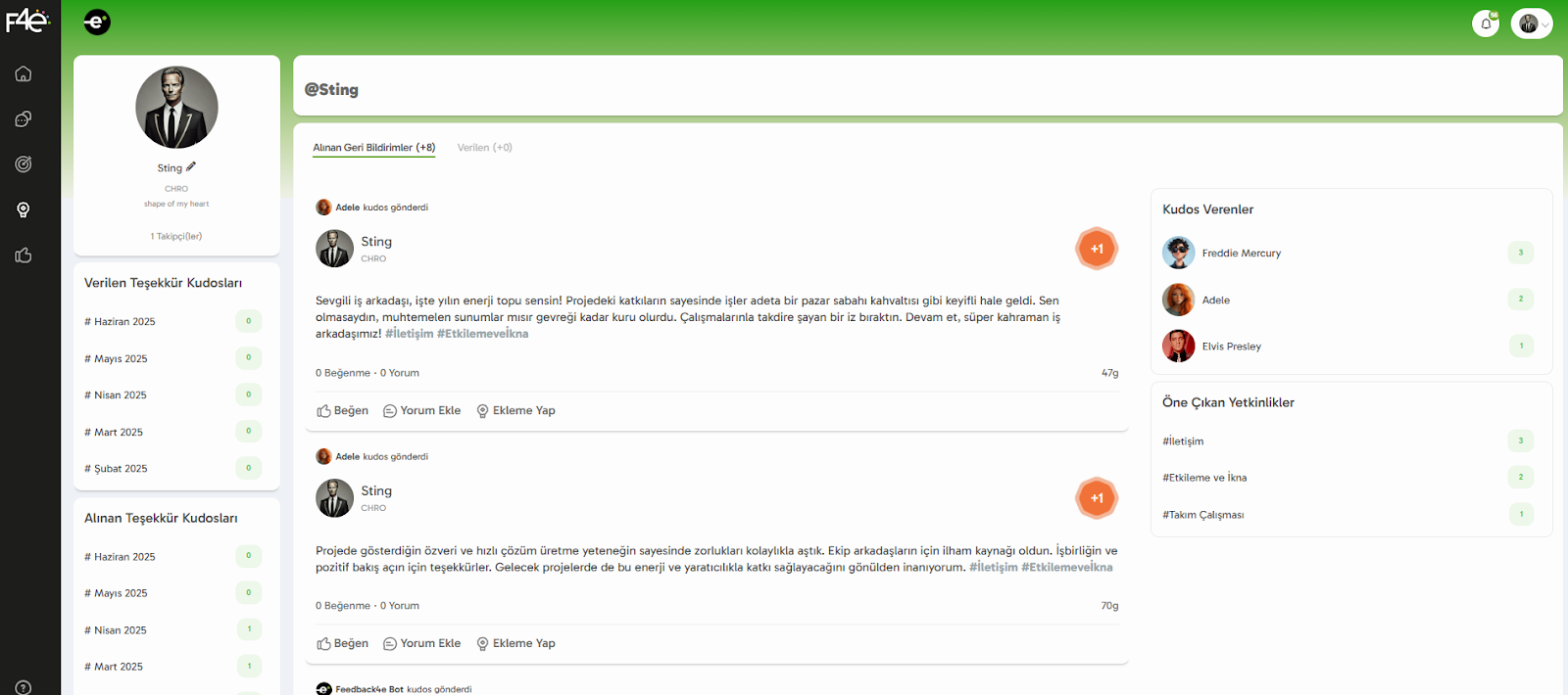 Kudos modülünde yalnızca başkalarına takdir göndermekle kalmaz, aynı zamanda kendine ait bir profil alanına da sahip olursun. Bu alan, hem kişisel istatistiklerini görmeni sağlar hem de kurum içi sosyal etkileşimi destekler. 🌟