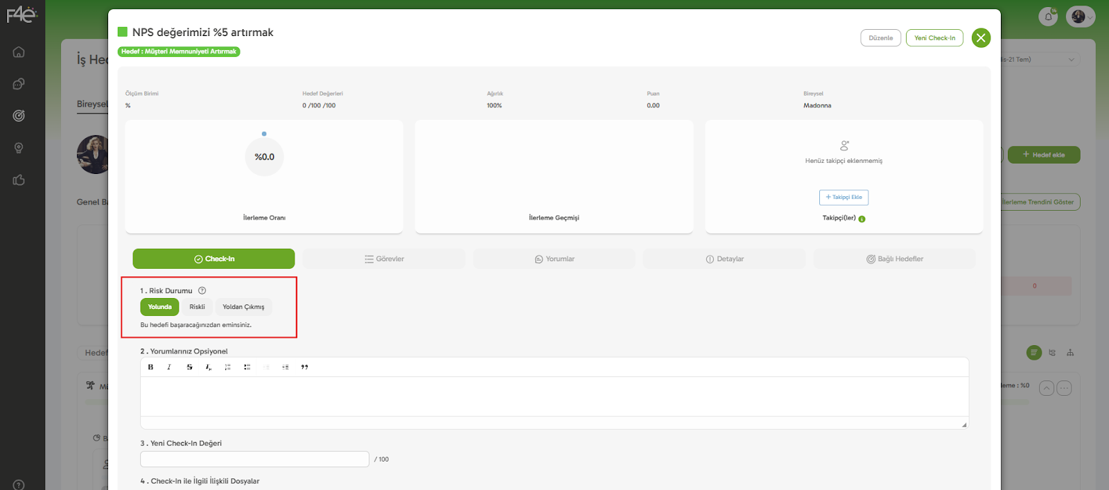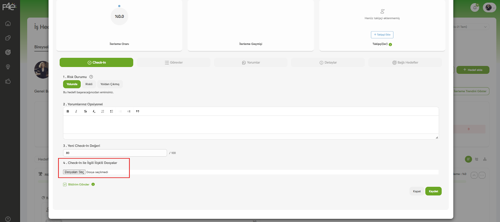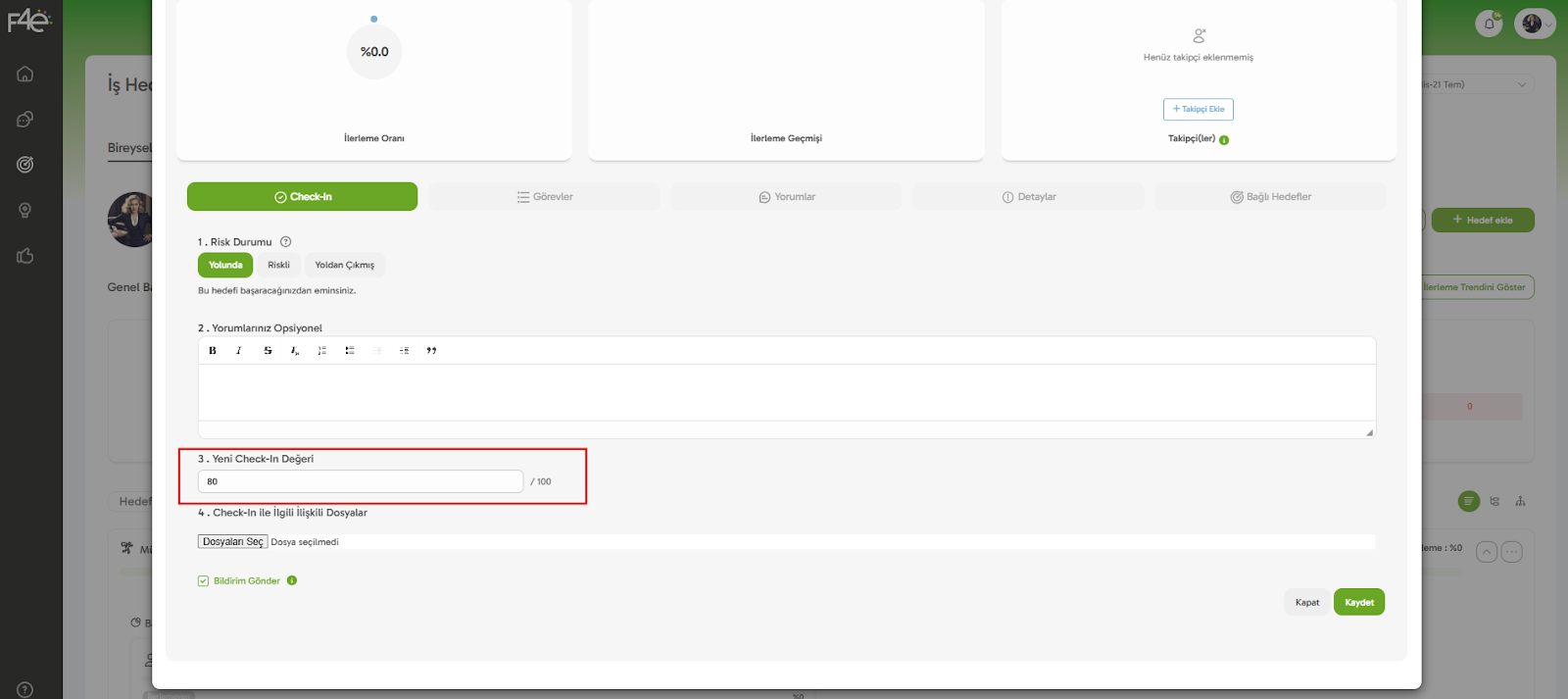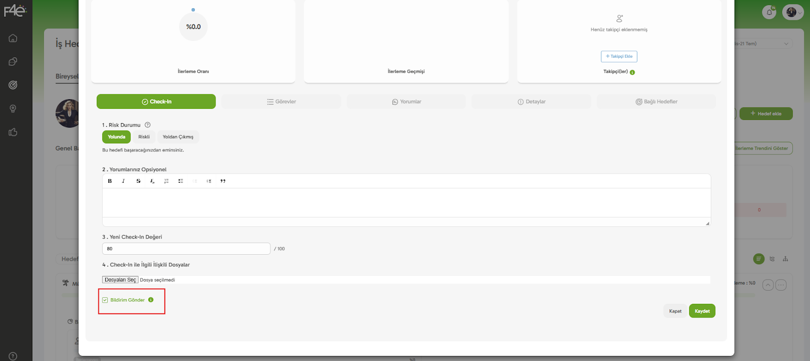 📊 Sistemdeki "Toplam İlerleme" ve "Hedef Risk Durumu" gibi göstergeler, bu check-in’lere göre hesaplanır.