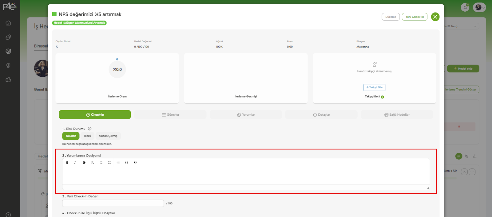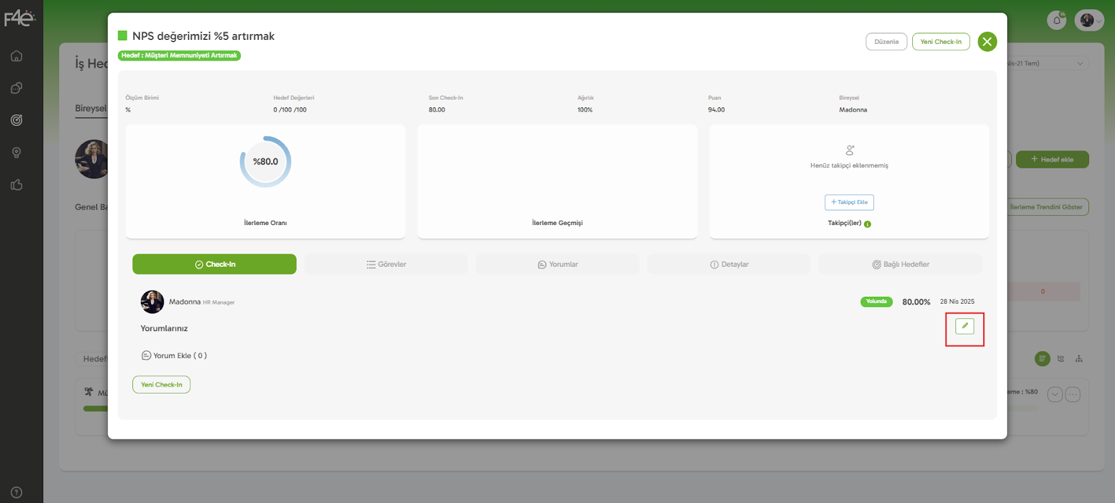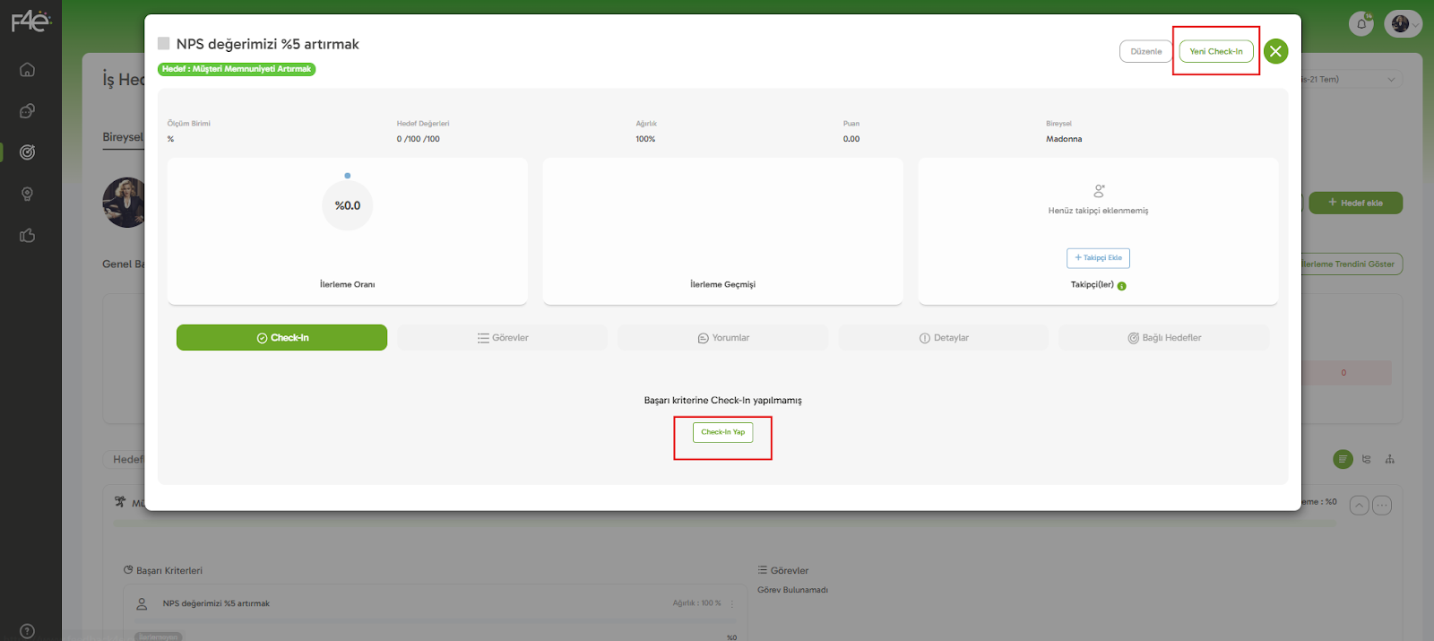 Yapman gereken aynı İş Hedefleri modülünde, check-in düzenlemek istediğin döneme ve hedefler sayfasına git! Check-in’de düzenleme yapmak istediğin başarı kriterinin üstüne tıkla. Karşına check-in detay ekranı çıkacaktır!