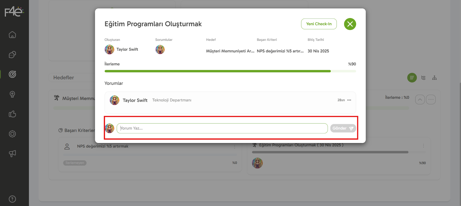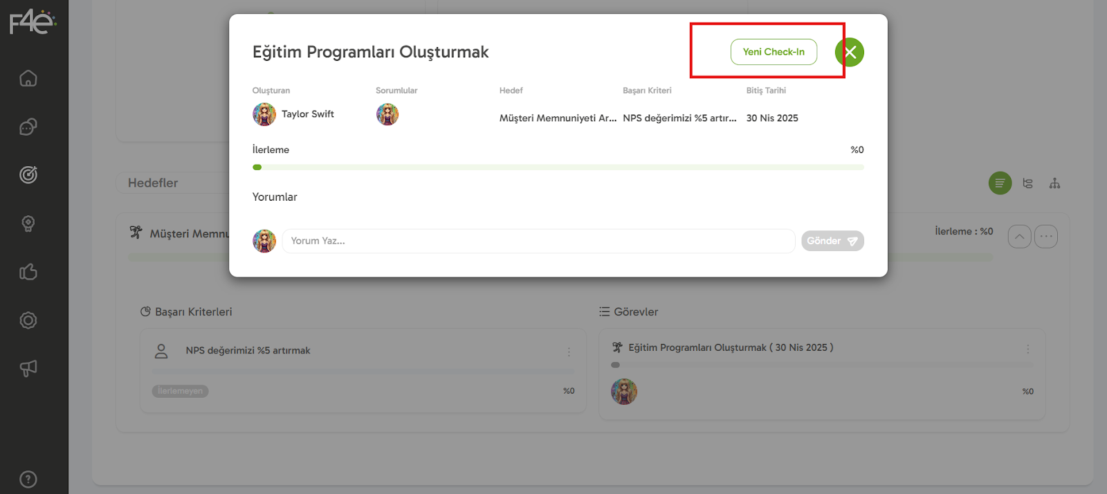 💡 Not: Tıpkı başarı kriterlerinde olduğu gibi, görevlerde de dönem boyunca check-in yaparak ilerlemeyi kayıt altında tutabilirsin. Ayrıca yorum alanında ekip arkadaşlarınla görev hakkında iletişim kurabilirsin.