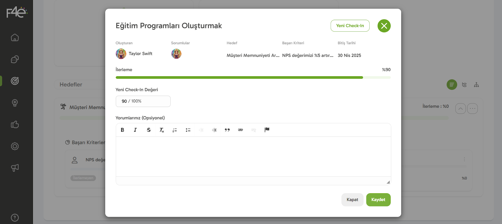 Yeni Check-In Değeri: İlerlemeni rakamsal ya da yüzdesel olarak gir.
