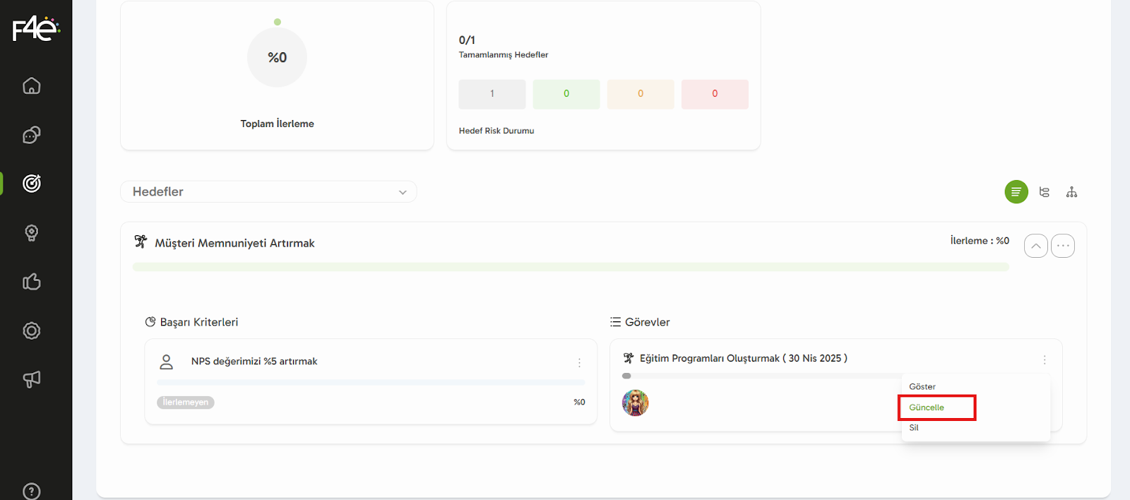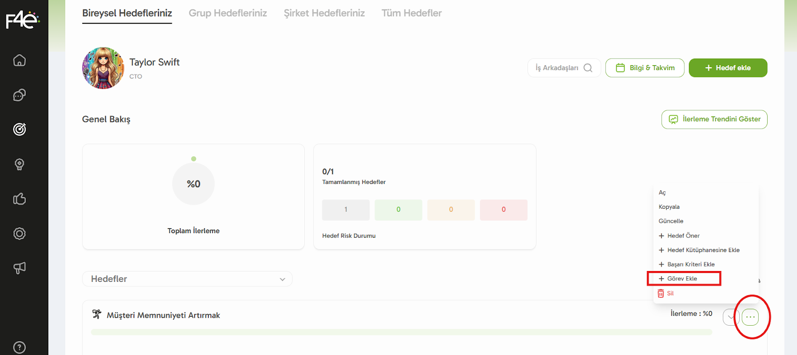2️⃣ Görev eklemek istediğin hedefin ya da başarı kriterinin yanındaki üç noktaya tıkla. Açılan menüde “Görev Ekle” seçeneğini göreceksin.
