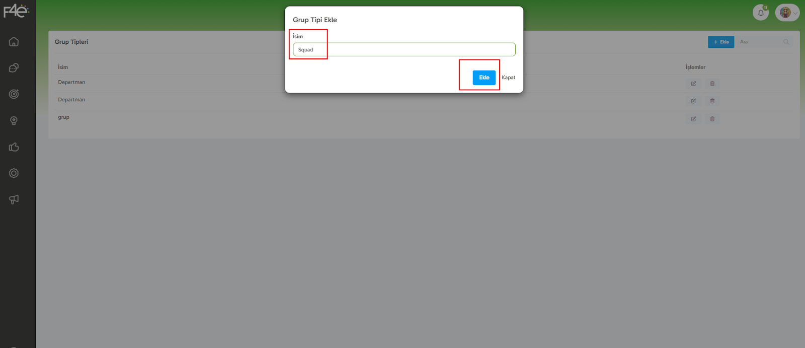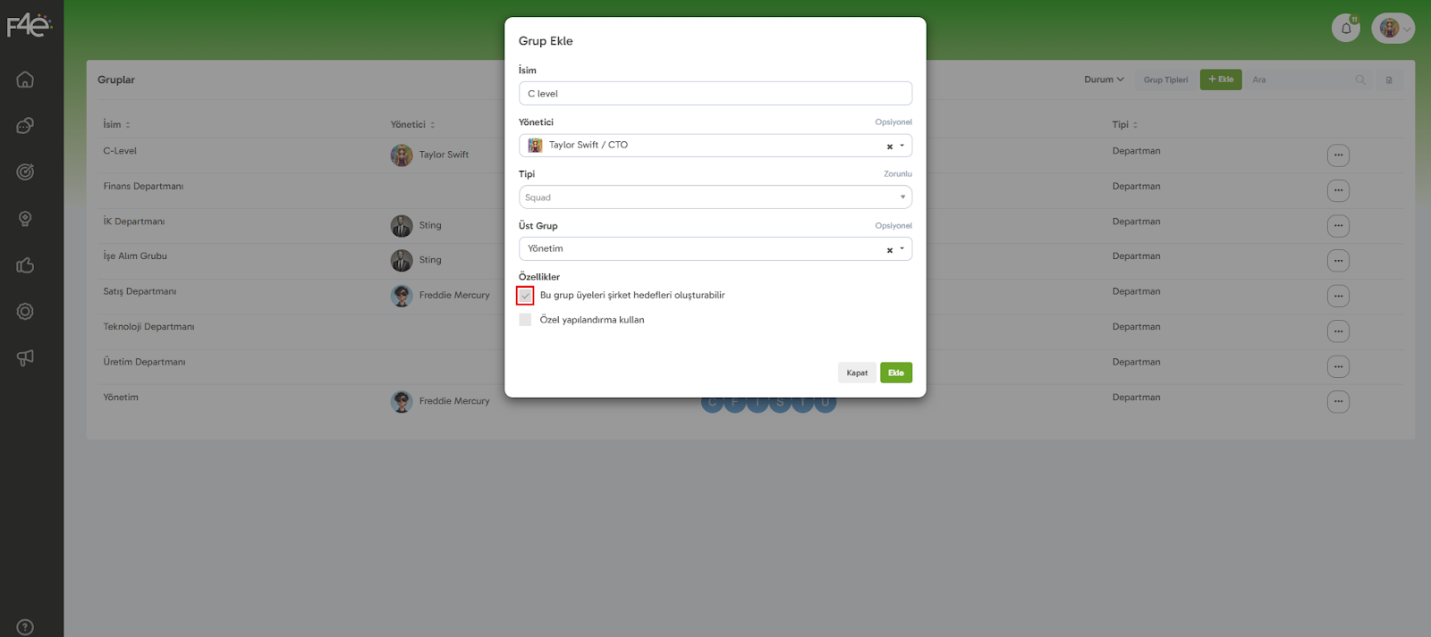 Örneğin, şirketin agile çalışıyorsa “Squad” tipi ekleyip, ona göre gruplar oluşturabilirsin.