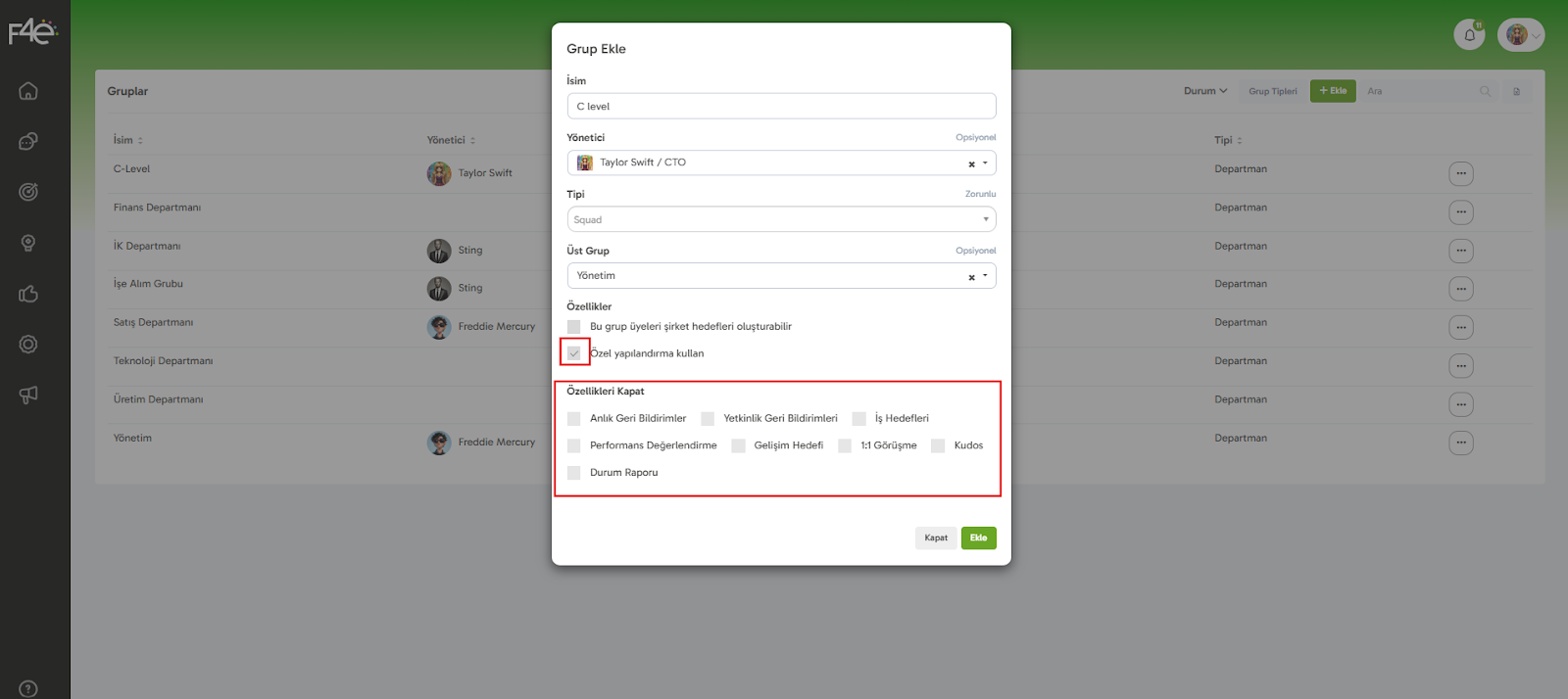Bu seçenek sayesinde gruba özel bazı özellikleri açıp kapatabilirsin. Yani ihtiyaçlarına göre esnek bir yapı kurabilirsin.