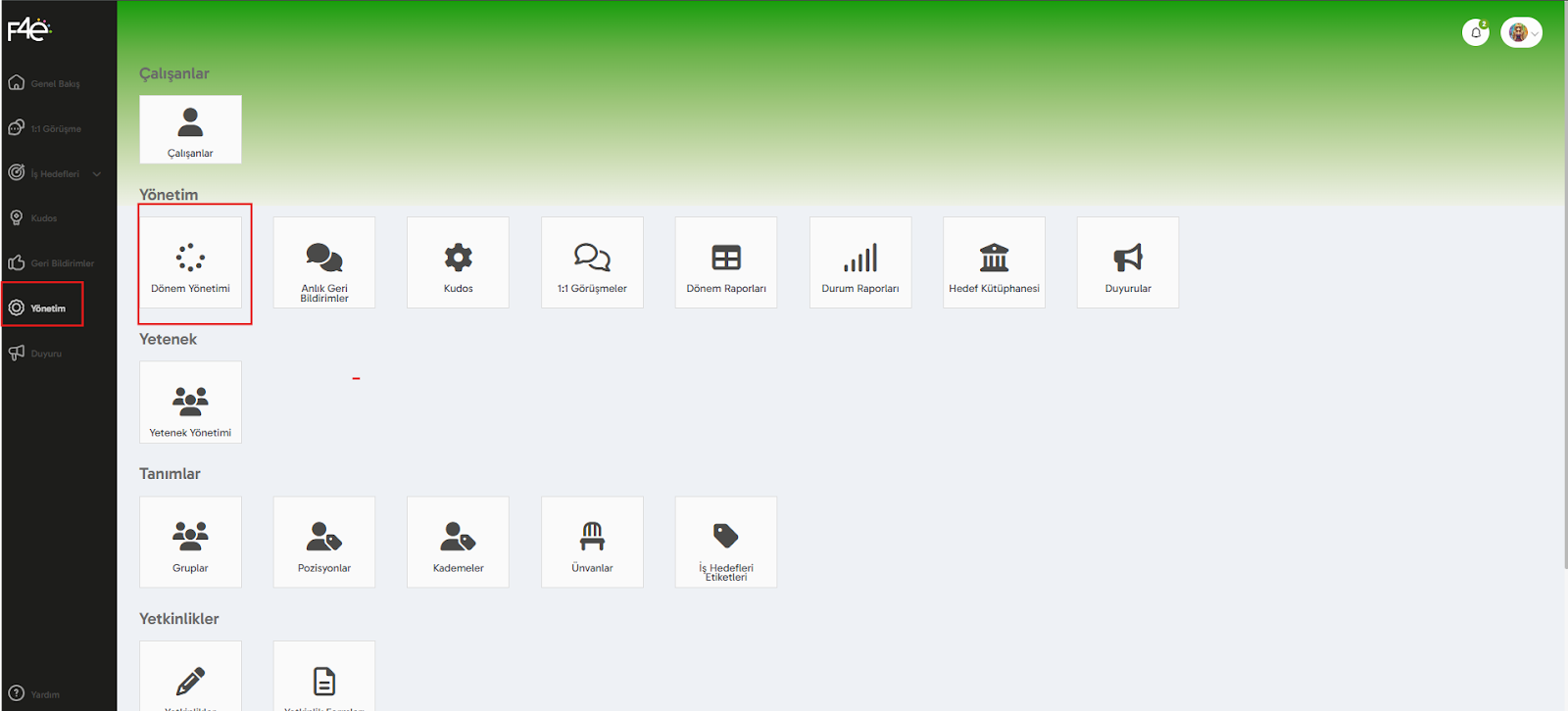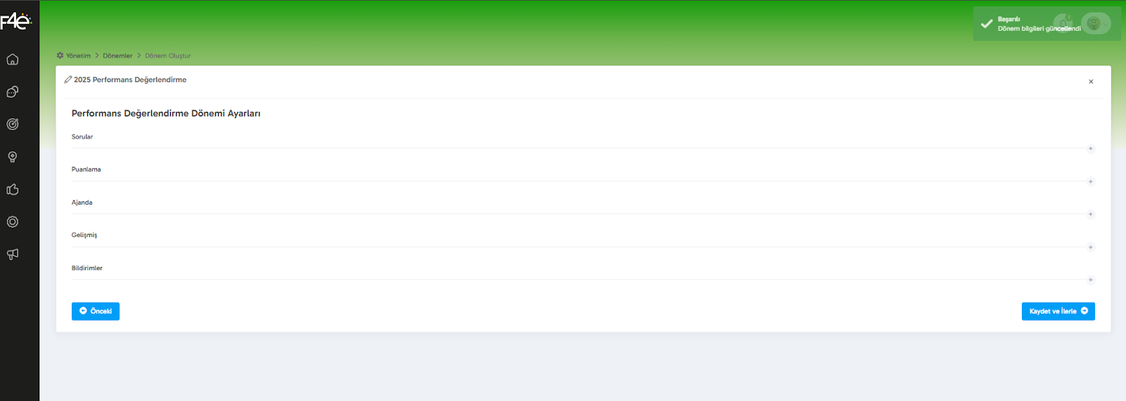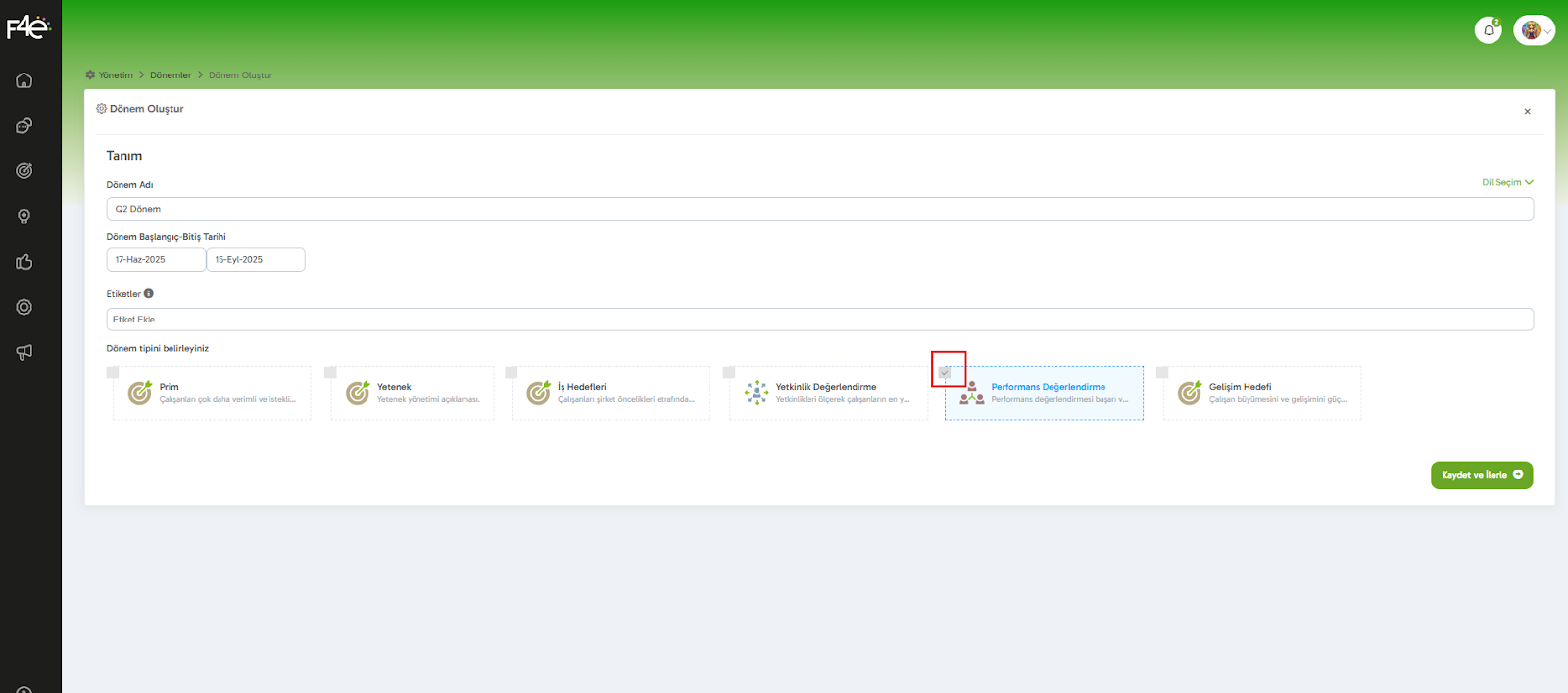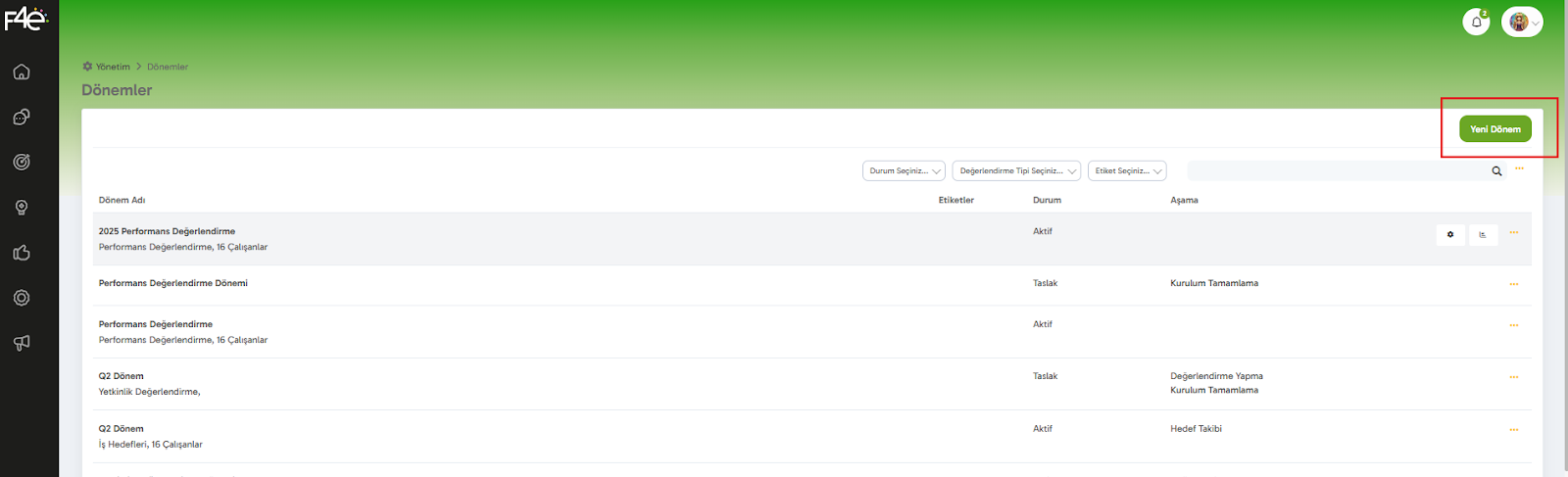 Performans sürecini başlatmak için önce bir yeni dönem oluşturmalısın.