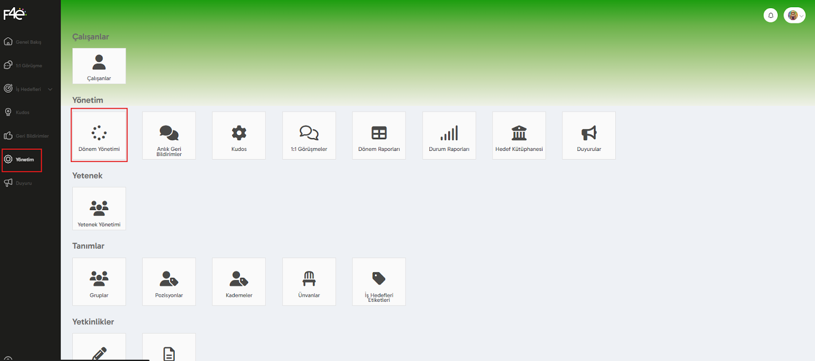 Menüden Yönetim > Dönem Yönetimi'ne git.