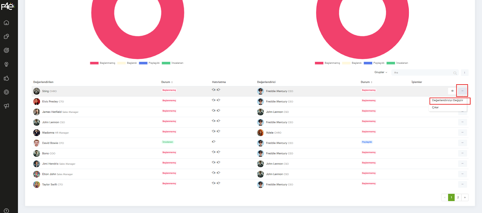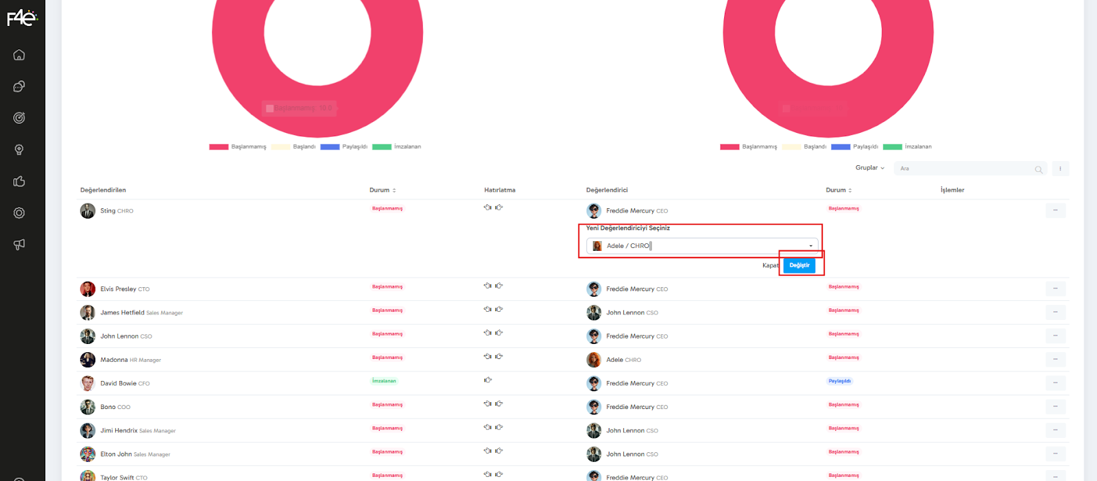 Açılan sayfanın alt kısmında, Değerlendirilenler tablosunda ilgili çalışanın satırındaki İşlemler > Değerlendiriciyi Değiştir seçeneğine tıkla.