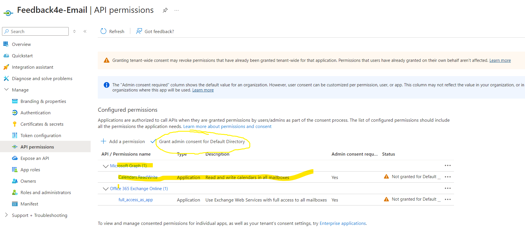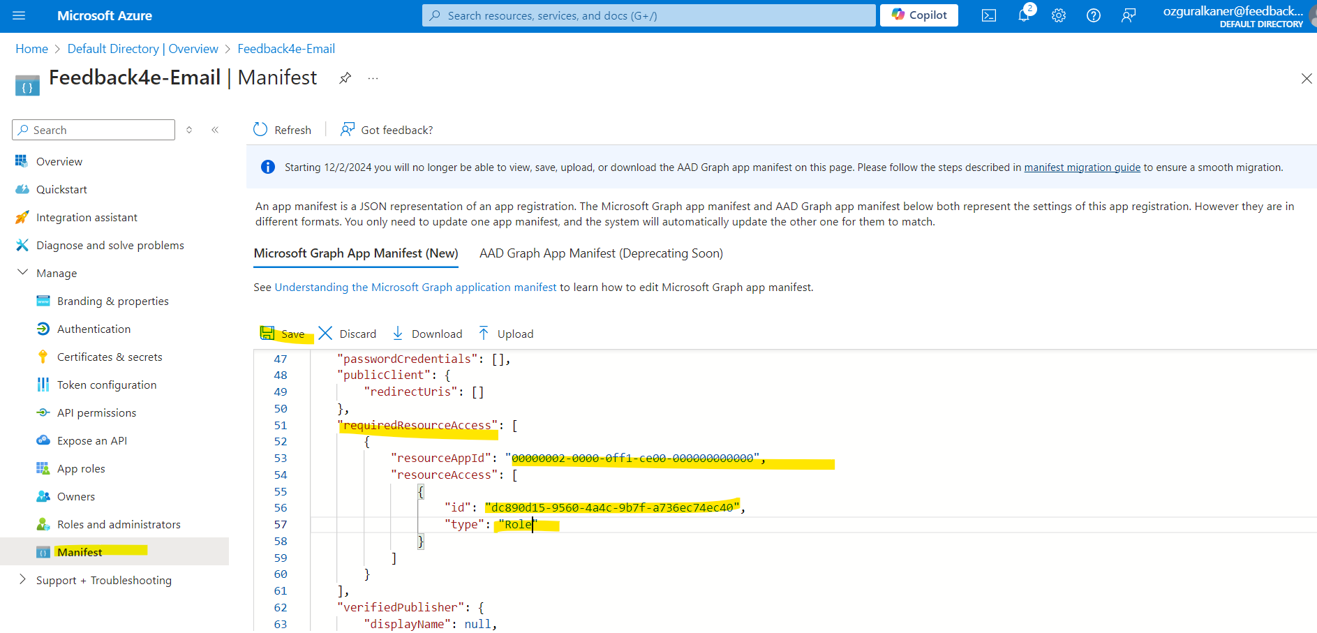 In the Manifest file of the app, replace the "requiredResourceAccess" property values with the ones highlighted below and save the file.
