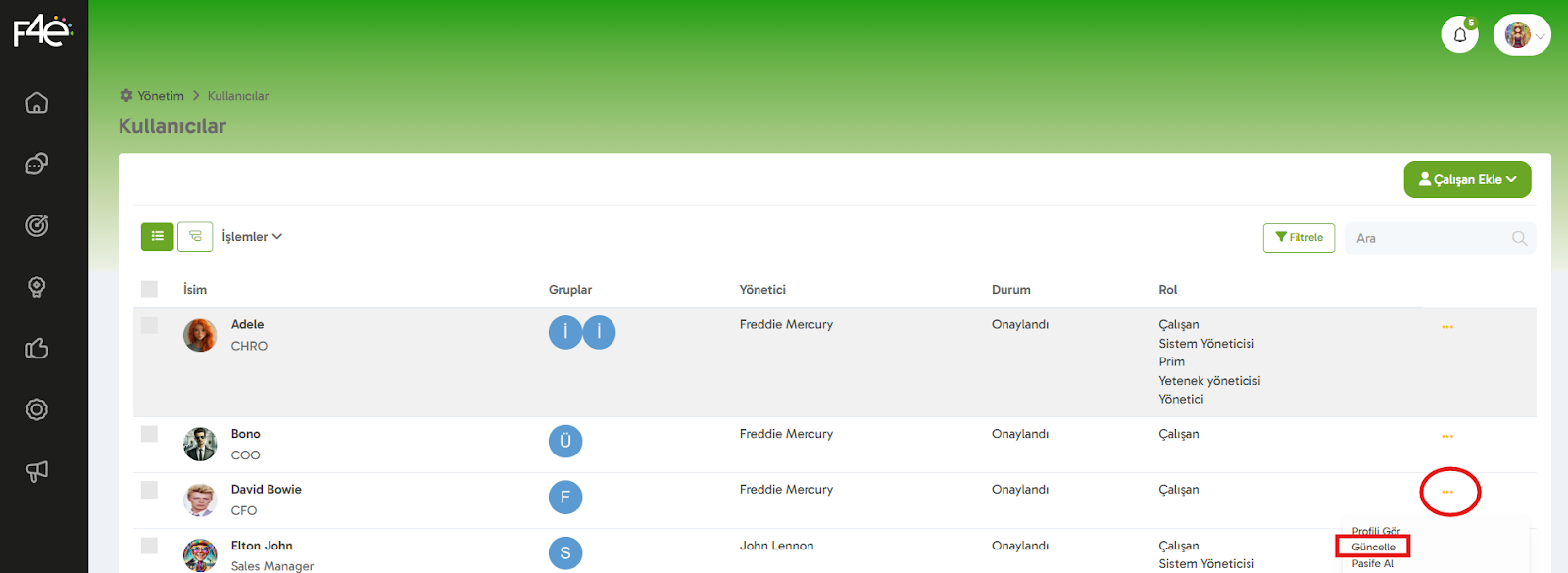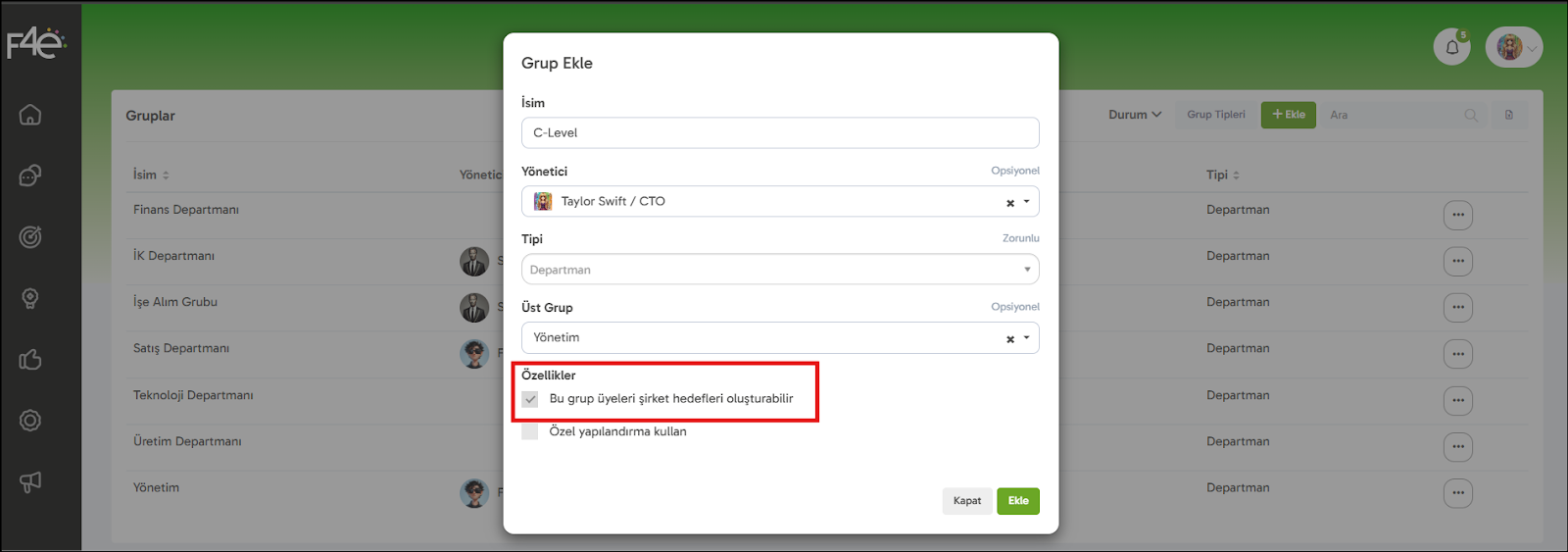 Bazı durumlarda, şirket hedeflerini yalnızca sistem yöneticisi değil, örneğin C-Level yöneticiler gibi özel bir çalışan grubu da ekleyebilsin, güncelleyebilsin, check-in yapabilsin istersin.