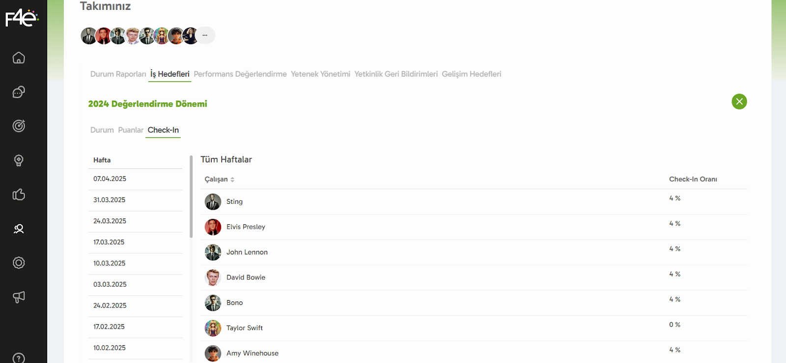Check-in sayfasında, takımının hafta bazlı ya da tüm haftalar düzeyindeki oranlarını görüntüle. Hedeflere doğru adım adım ilerle! 🏁