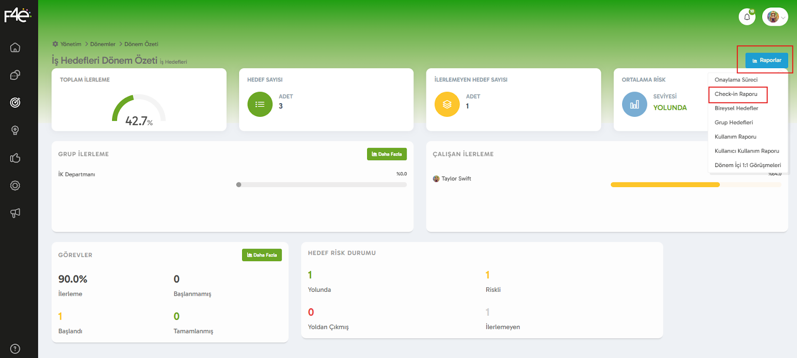 Açılan ekranda sağ üstteki Mavi Raporlar butonuna basıyoruz ve oradan Check-in Raporu'nu seçiyoruz. 🔍