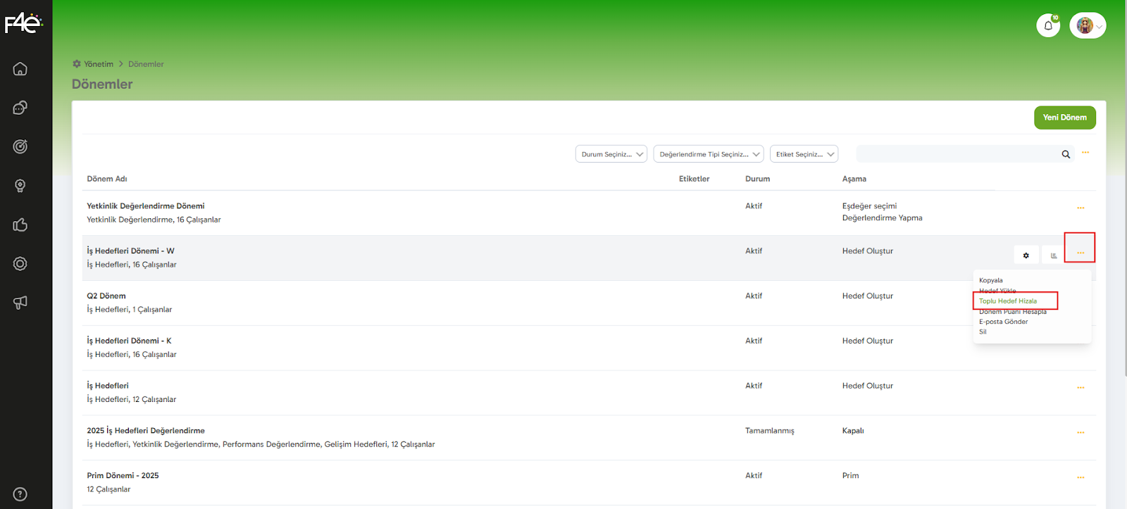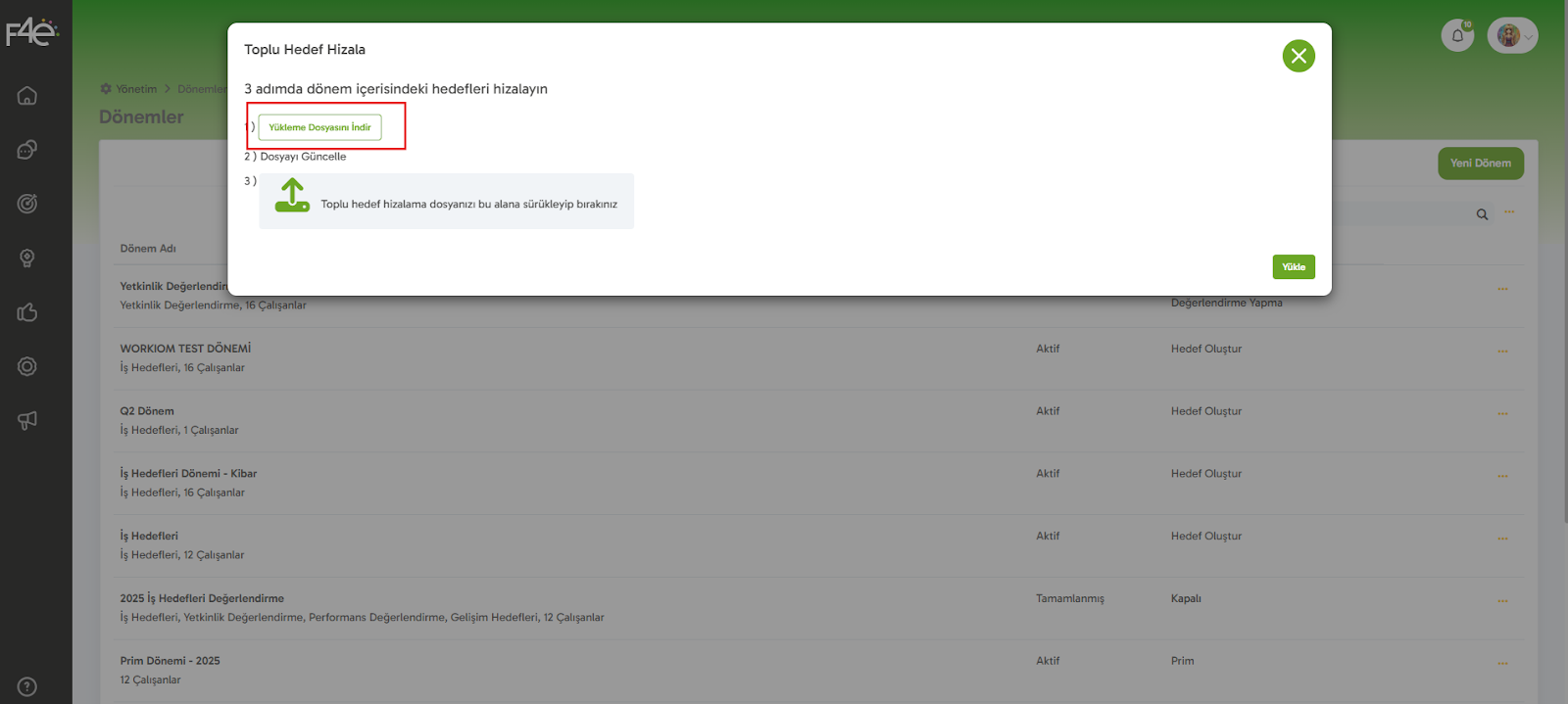 Birden fazla hedefi sisteme hızlıca eklemek mi istiyorsunuz? ? Toplu Hedef Yükleme özelliği tam da bunun için var! Adım adım ilerleyelim: 1. Menüden Başlayalım ? Yönetim > Dönem Yönetimi > İlgili Döneme ait üç nokta butonu > Hedef Yükle linkine ...
