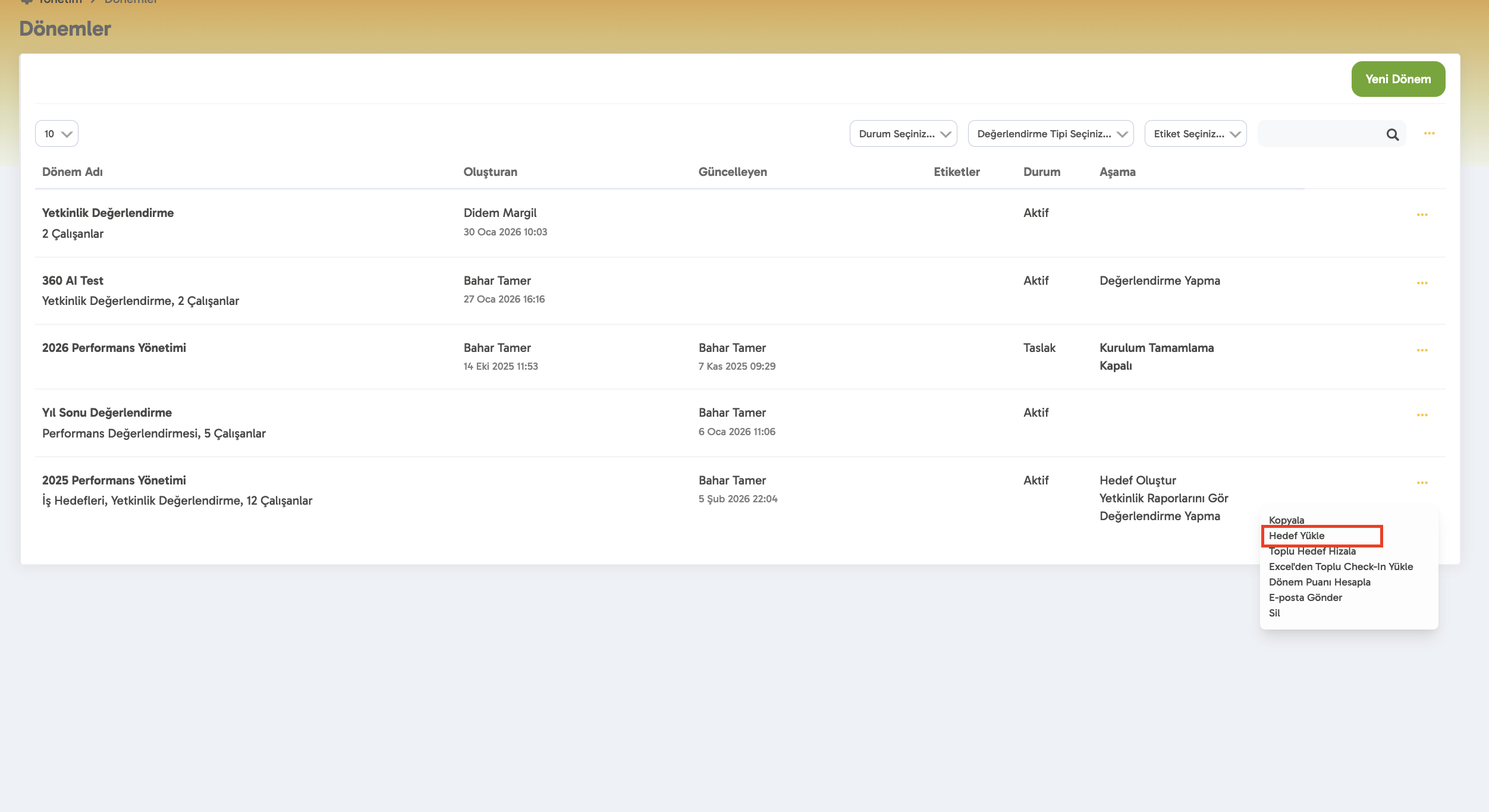 Yönetim > Dönem Yönetimi > İlgili Döneme ait üç nokta butonu > Hedef Yükle linkine tıklayın.