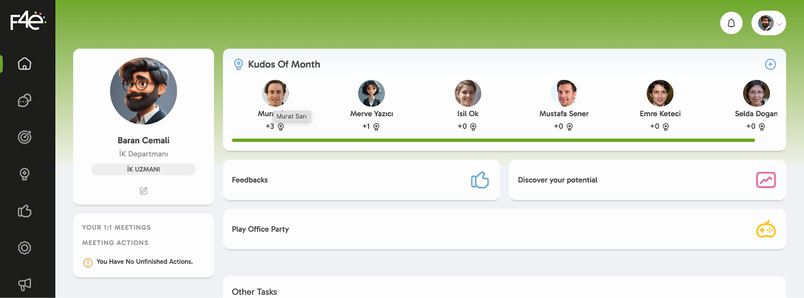 On the F4e platform, the “Kudos of the Month” section appears both on the homepage and inside the Kudos module. It highlights employees who have received the most appreciation in a given month.