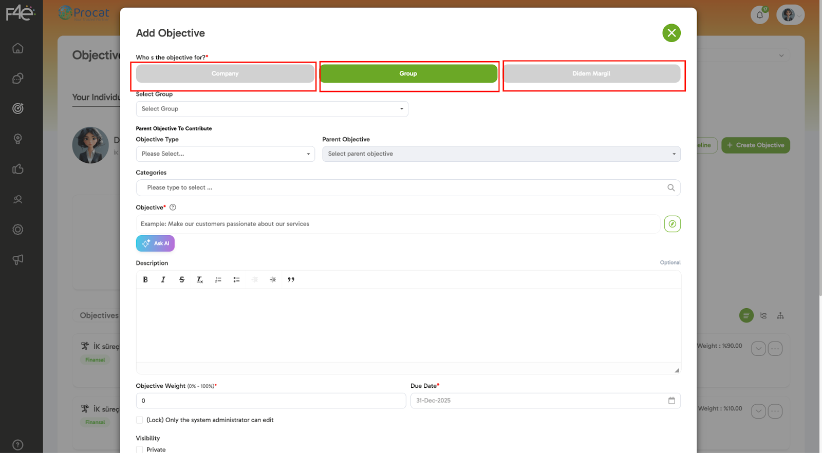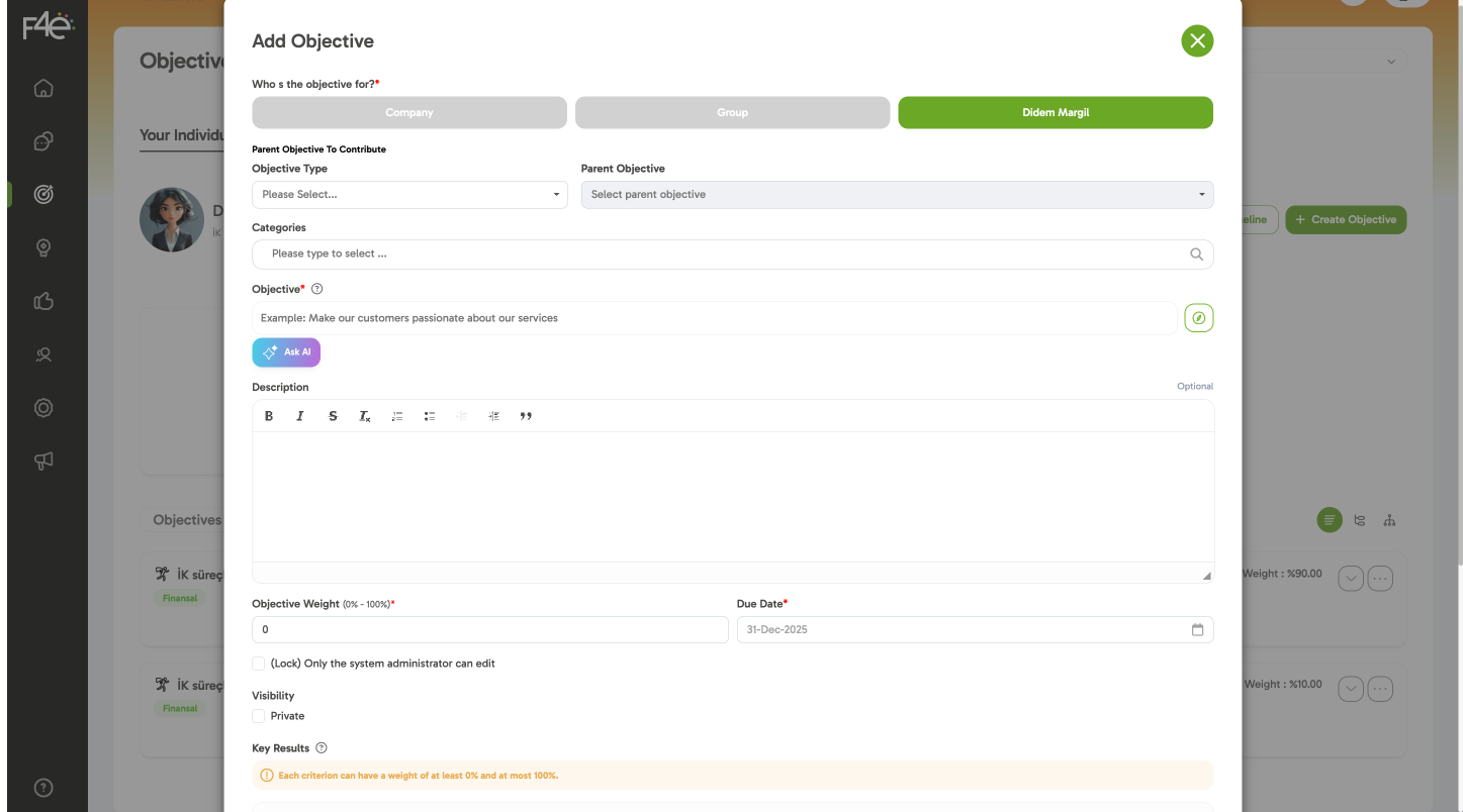 ✍️ In the “Who is this goal for?” field, the employee will only see themselves.