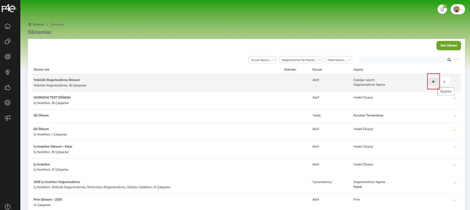 Yönetim > Dönem Yönetimi > İlgili Yetkinlik Değerlendirme Dönemi> İlgili Dönemin Ayarlar Butonu