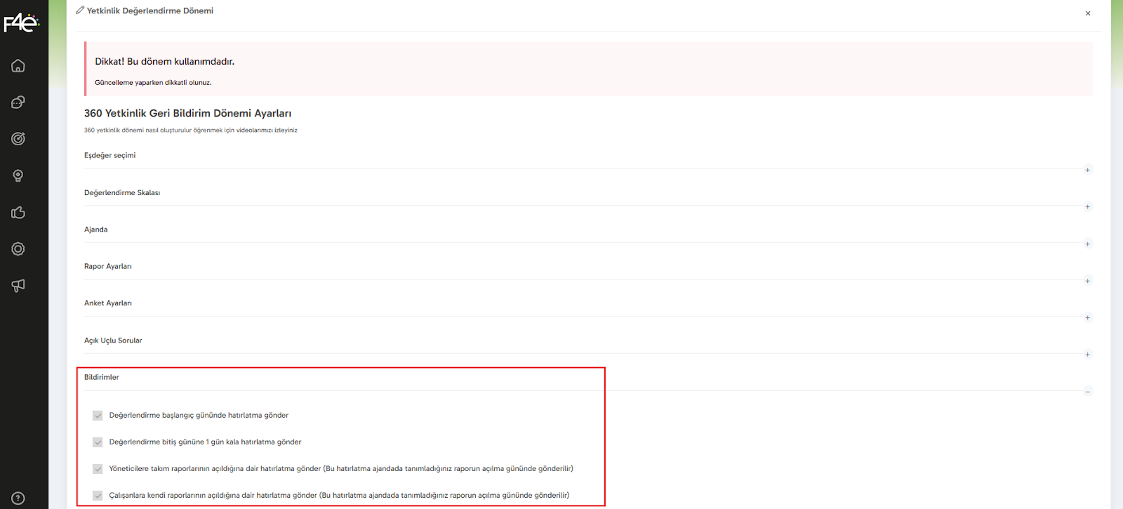 Açılan sayfada kaydet ve ilerle dedikten sonra “360 Yetkinlik Geri Bildirim Dönemi Ayarları” bölümünü göreceksin. Bu sayfada yer alan “Bildirimler” kısmını açtığında bildirimlerle ilgili tüm kontrollerin ayarları seni bekliyor!